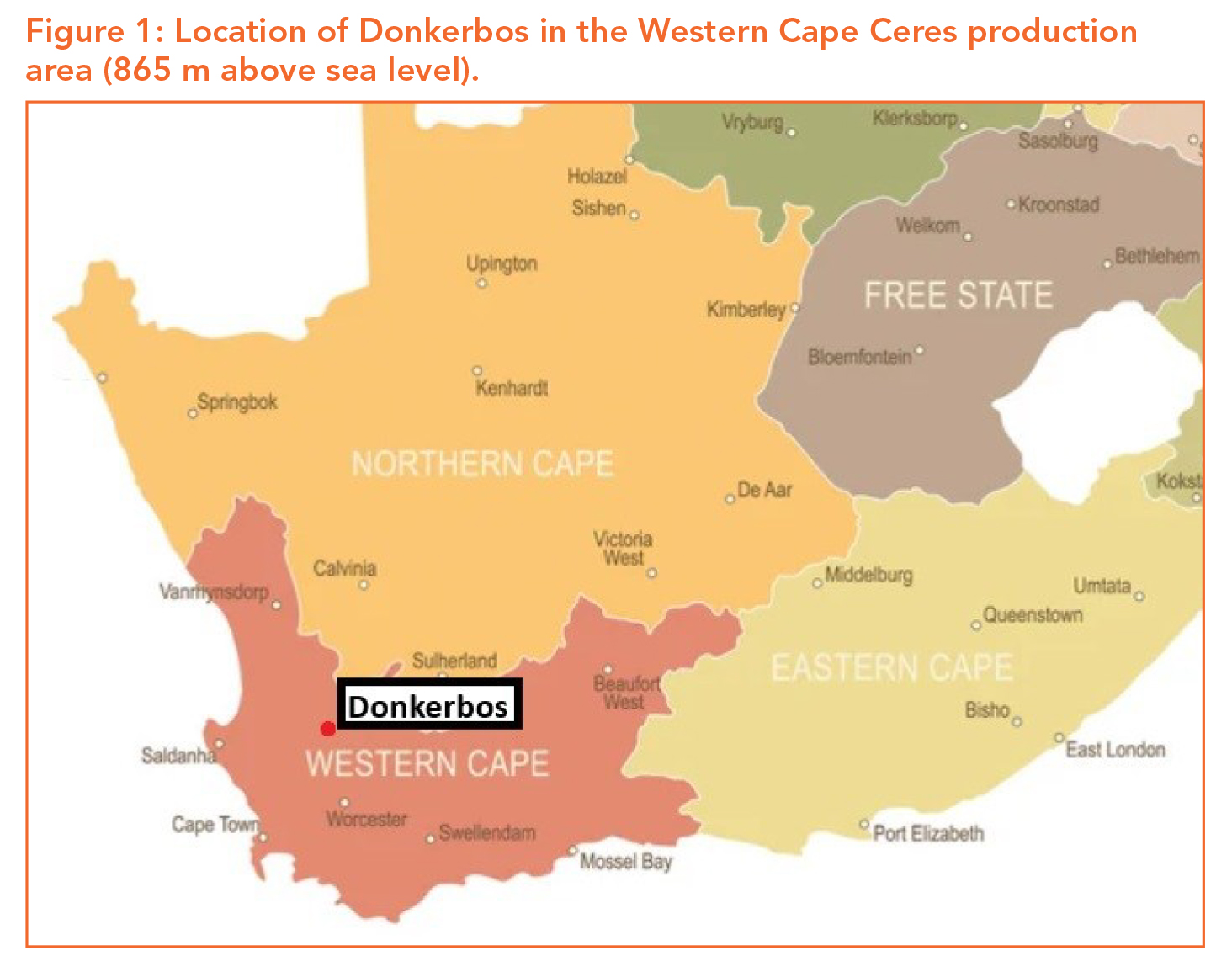 The cultivar trial was conducted at Donkerbos in the Koue Bokkeveld, which falls within the winter rainfall region and has recorded an average annual rainfall of 647 mm over the past six years, according to data from the Donkerbos weather station located on the farm. Summers in this region are warm, whereas winters tend to be cold and wet due to regular snow on the surrounding mountains.