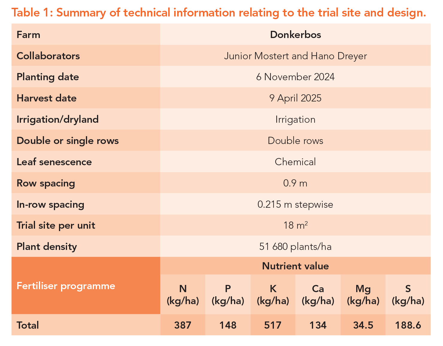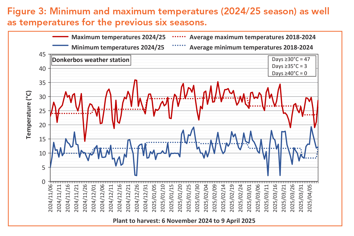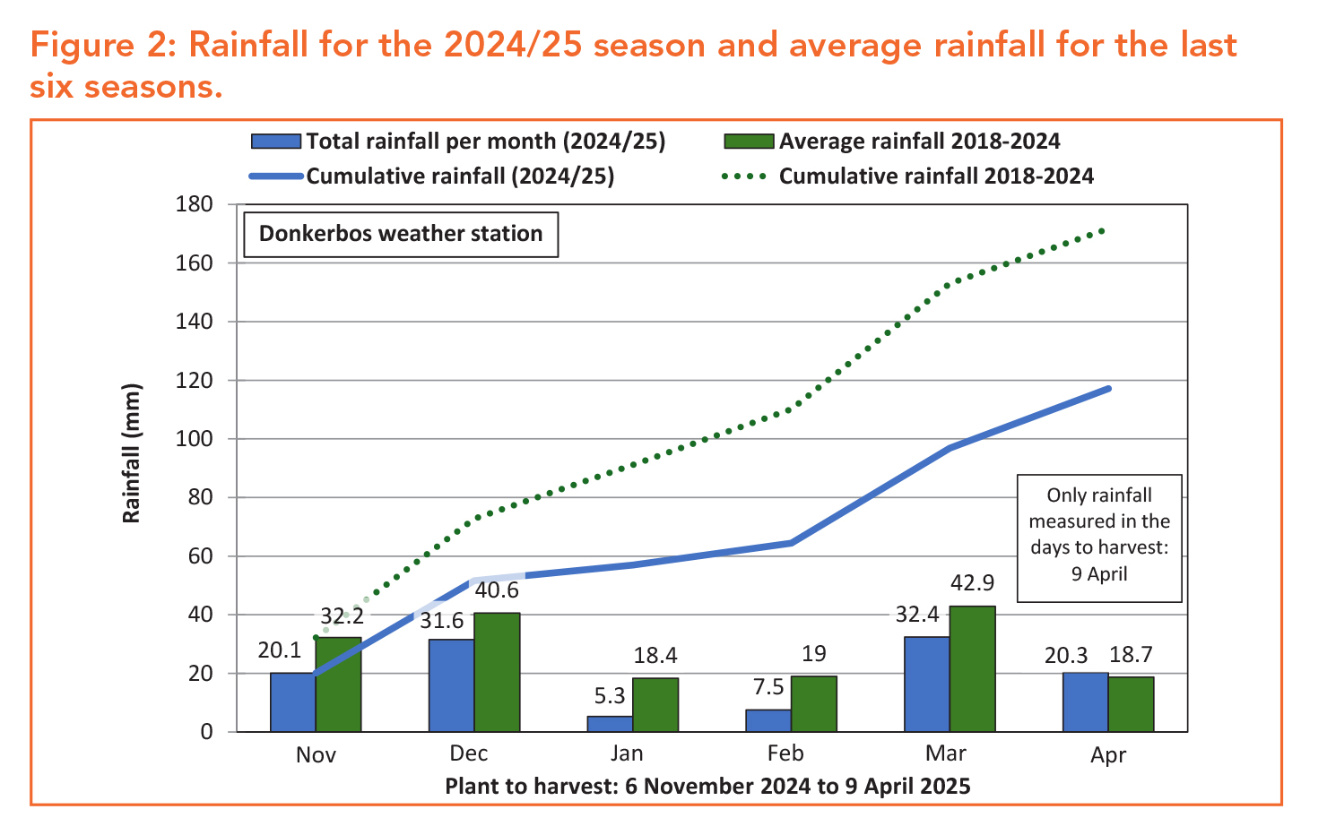 The 2024/25 season (Figure 2) received below average rainfall during most of the active growing season. Because the trial was conducted under irrigation, optimal irrigation scheduling was applied and was likely one of the factors contributing to the above average yield.