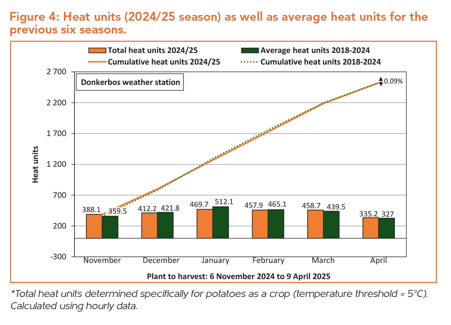 The trend of heat units available for this season’s cultivar trial at Donkerbos appears to be equal to the long-term data trend of heat units (Figure 4).