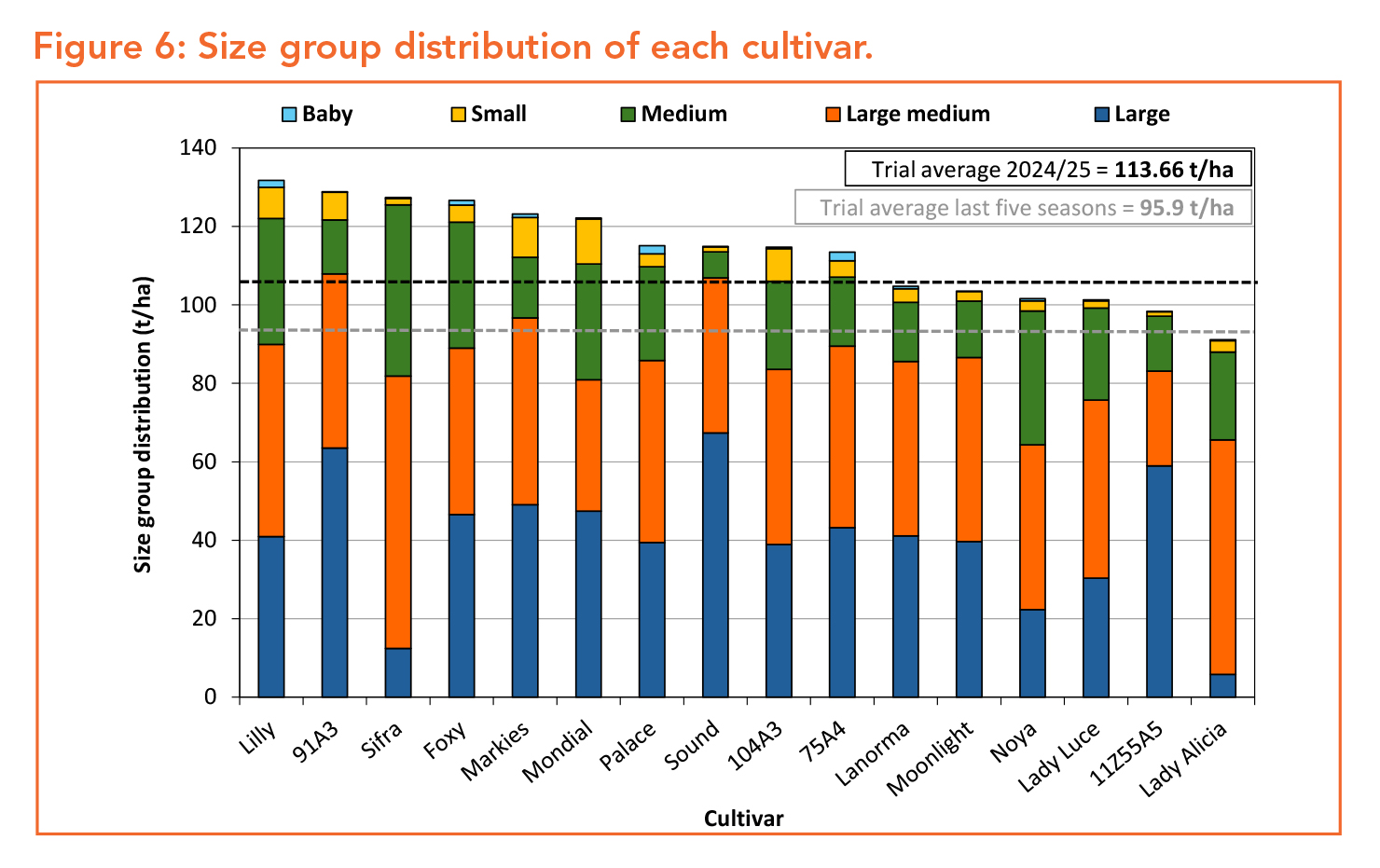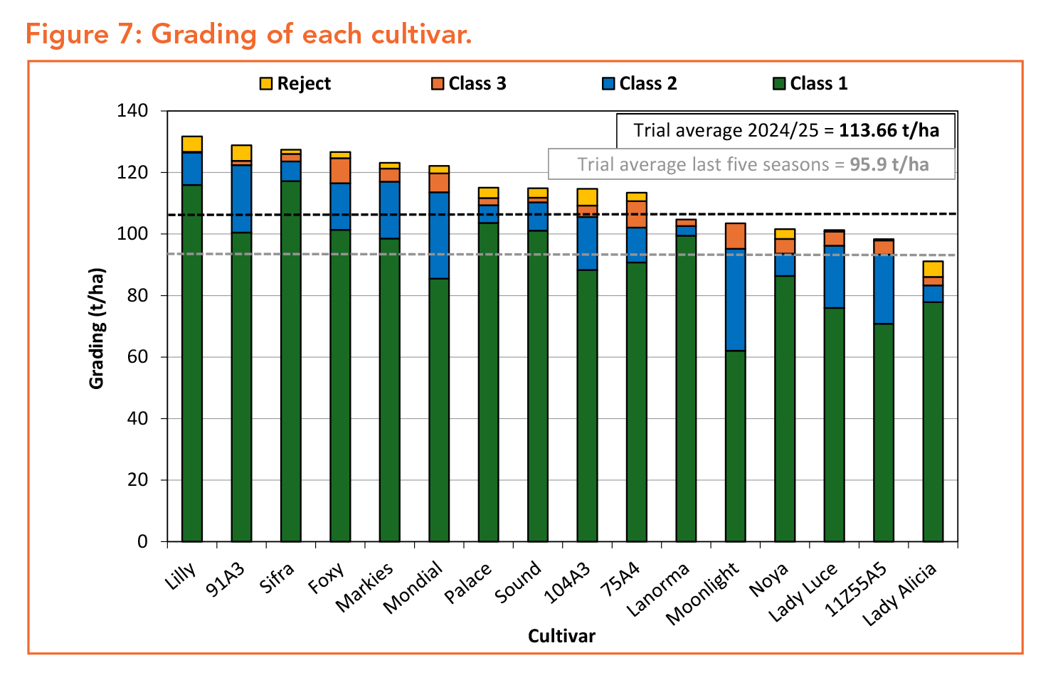 The average yield of the trial for the 2024/25 season was 113.66 t/ha – significantly higher than the previous six seasons’ average of 93.2 t/ha, and possibly a record yield in the history of this cultivar trial. The higher yield could be attributed to coincidence and good management practices, such as optimal timing of planting and harvesting, healthy soil, and good irrigation scheduling. Lilly, 91A3, Sifra, Foxy, Markies and Mondial delivered the highest yields, with no statistical difference in yield. Sifra, Lilly, and Palace achieved the highest marketing index.