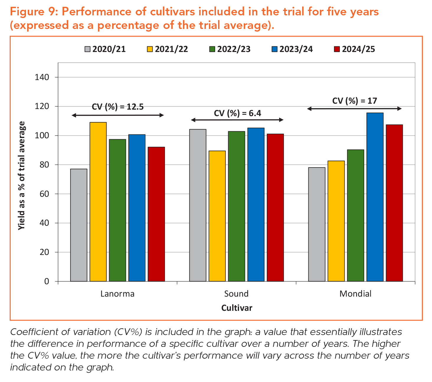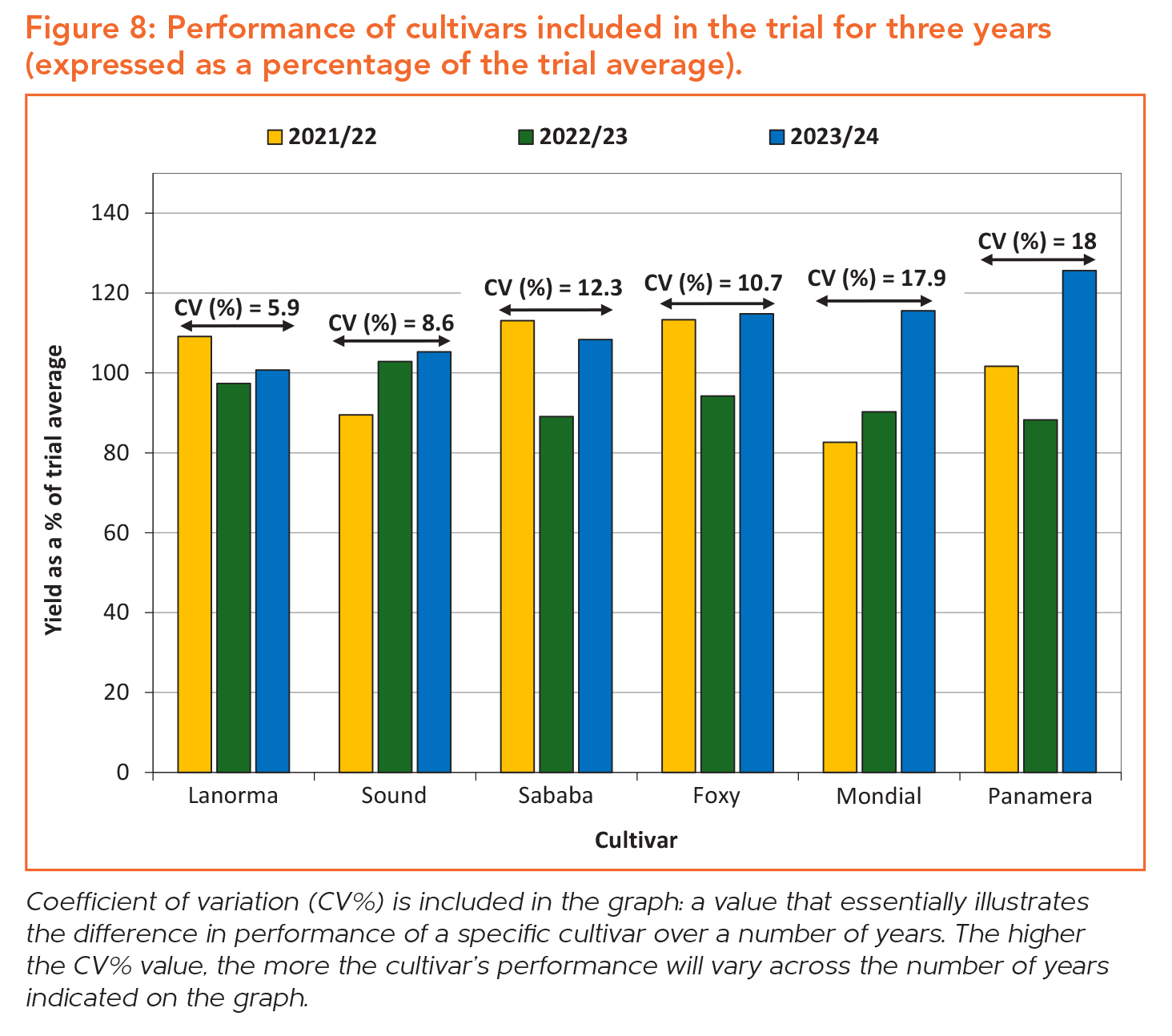 Yield data recorded during harvesting is statistically processed using the GenStat® program. The Tukey test of least significant differences (LSD) was used to separate the mean. The cultivar effect during this trial (Figure 5) was statistically significant (p<0.05) and the coefficient of variation (CV) was low (7.1%). These factors indicate that the trial was well executed, and the results are therefore reliable.