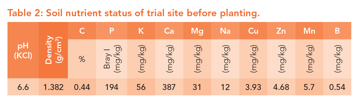 The trial was conducted in sandy soil and laid out in a randomised block design with three replications per cultivar. Table 1 contains additional technical information regarding the trial. Soil samples were taken prior to planting to determine the soil’s nutritional profile at the trial site (Table 2).