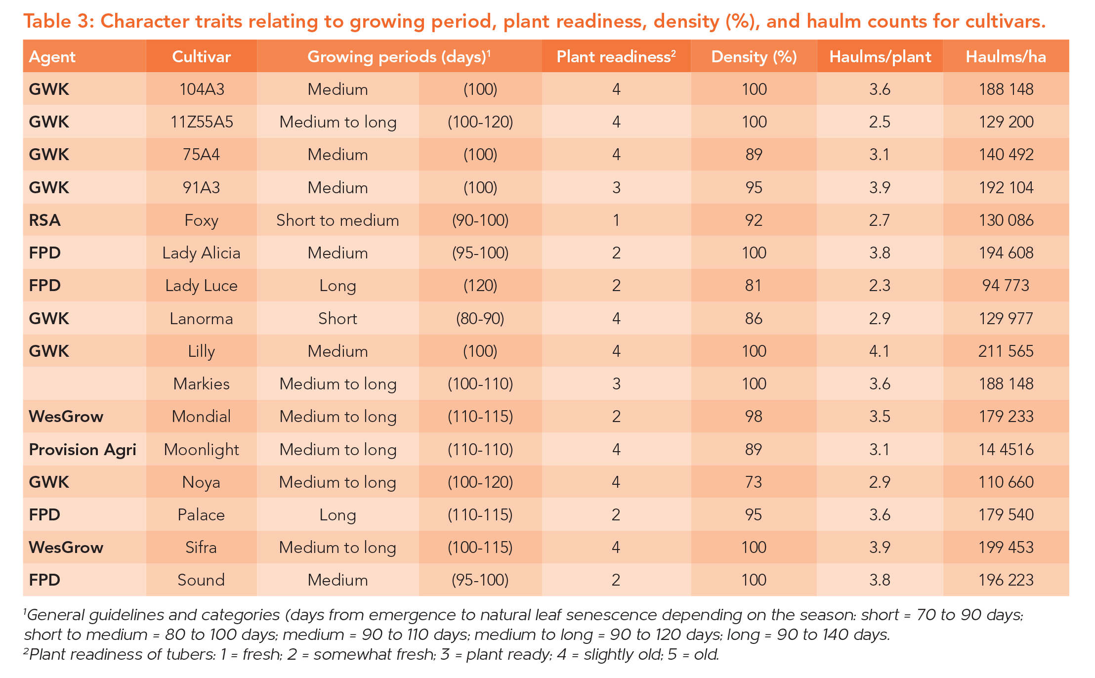 The cultivar trial includes cultivars with short and long growing periods. Growing periods can therefore influence the eventual yield of certain cultivars. The length of growing periods is subject to the nature of the seasons but are generally regarded as the time that passed from emergence to natural leaf senescence. Table 3 sets out how these growing periods differ among cultivars. Table 3 also sets out the plant readiness of tubers at the time of planting, density, and the haulm count observed later in the growing season.