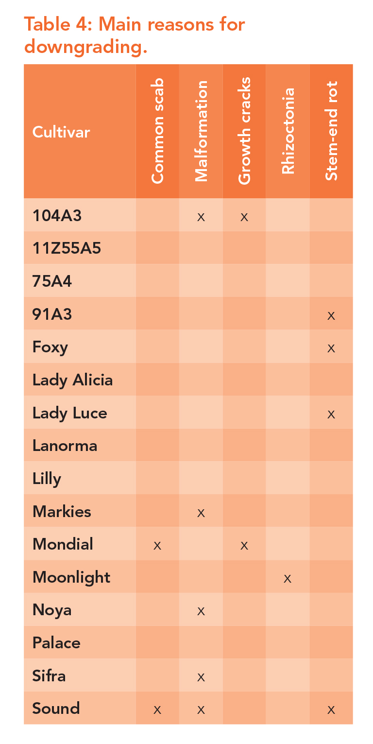 The main reasons for downgrading are indicated in Table 4. Malformation and stem-end rot were the major causes for downgrading potatoes to Class 2 and 3. Stem-end rot typically occurs at the end of a growing season.
