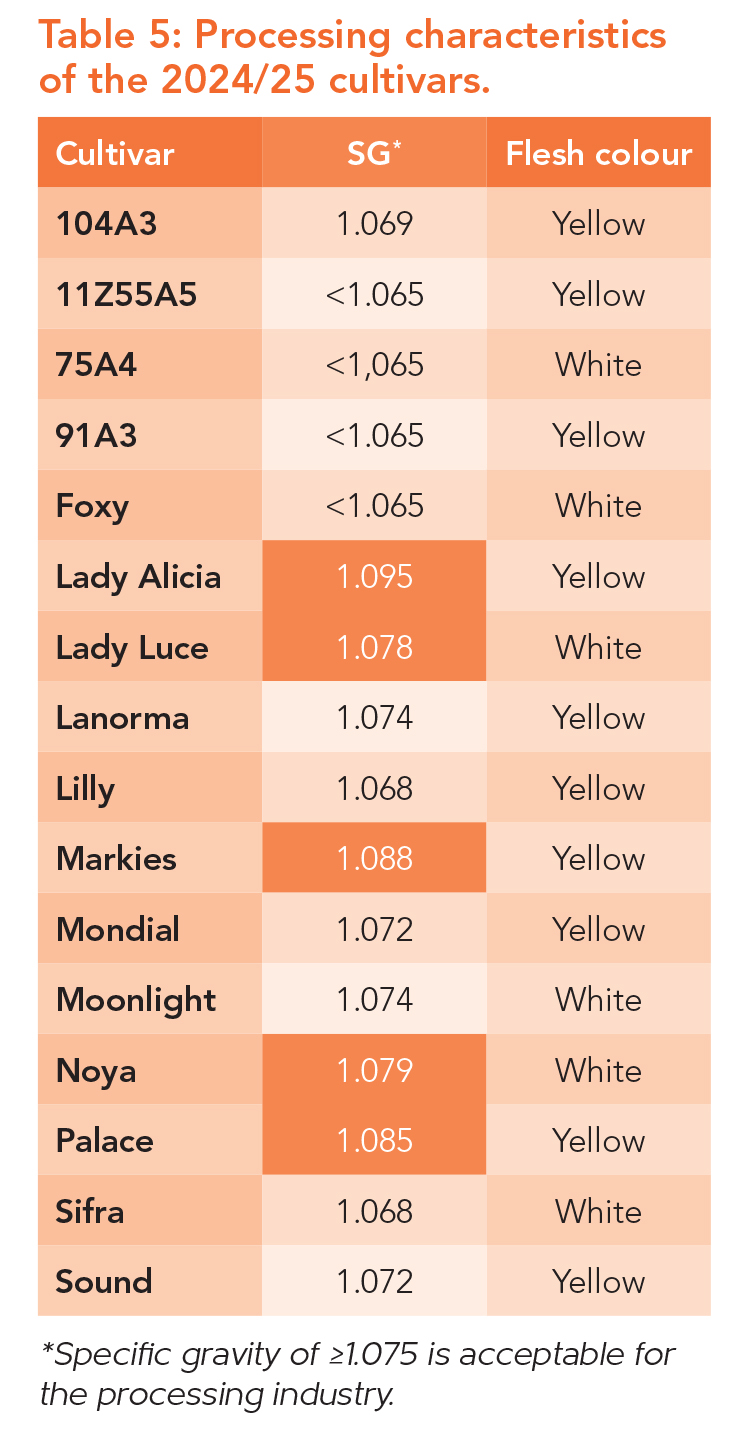 Lastly, processing characteristics can also be evaluated by looking at the internal quality of potatoes. To adhere to processing requirements, cultivars must meet a specific gravity (SG) of ≥1.075 (Table 5). Many of the cultivars met the SG requirements. Internal quality was also assessed to determine whether the cultivars displayed signs of hollow heart or brown spot, but none were observed as having internal defects. – Enrike Verster, Potatoes SA