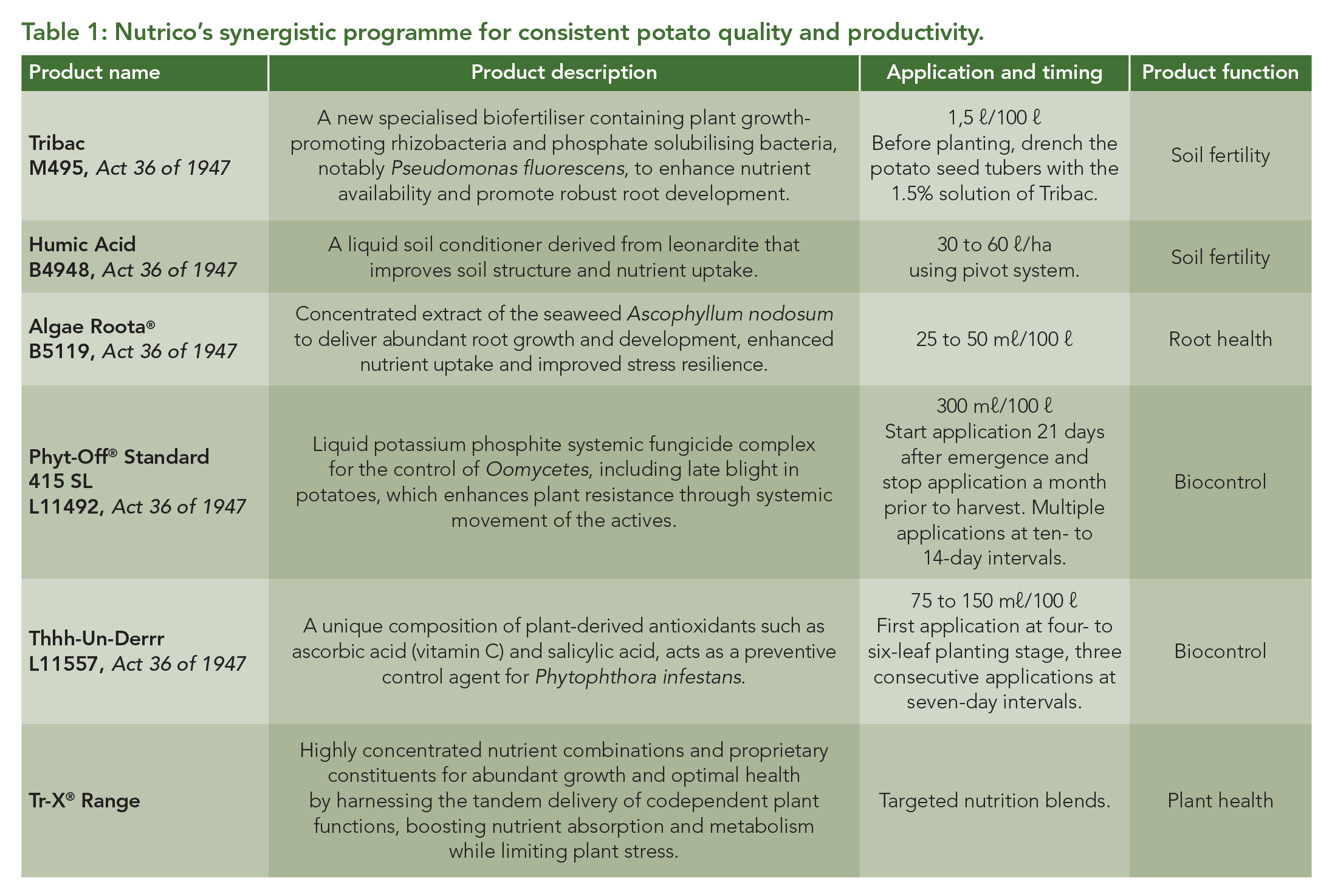 For more information on our extensive range of products for sustainable potato production, visit www.nutrico.co.za or contact Nutrico on 011 392 4072 or 021 807 5922.