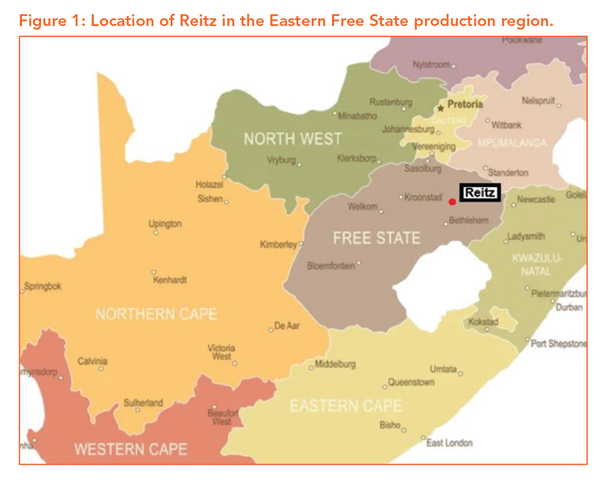 Reitz falls within South Africa’s temperate summer rainfall region (Figure 1) and has received average annual rainfall of about 509 mm over the past 20 years. This region experiences warm summers and very cold winters, with frost from mid-May to early September.