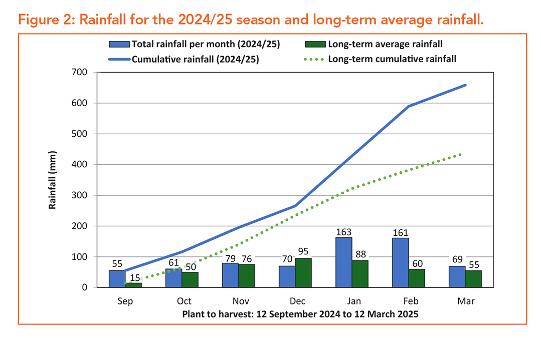 The rainfall trend for the 2024/25 season (Figure 2) shows considerably more rainfall than the cumulative long-term average. Excessive, above-average rainfall was recorded particularly during the final months before harvest, which resulted in a higher percentage of rejected potatoes due to their quality (Figure 7).