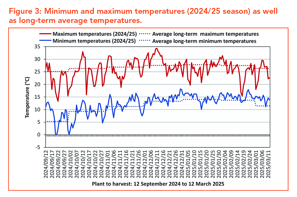 Figure 3 illustrates the minimum and maximum temperatures. The relevant season experienced particularly large fluctuations in maximum temperatures, especially during the first three months of the growing period.