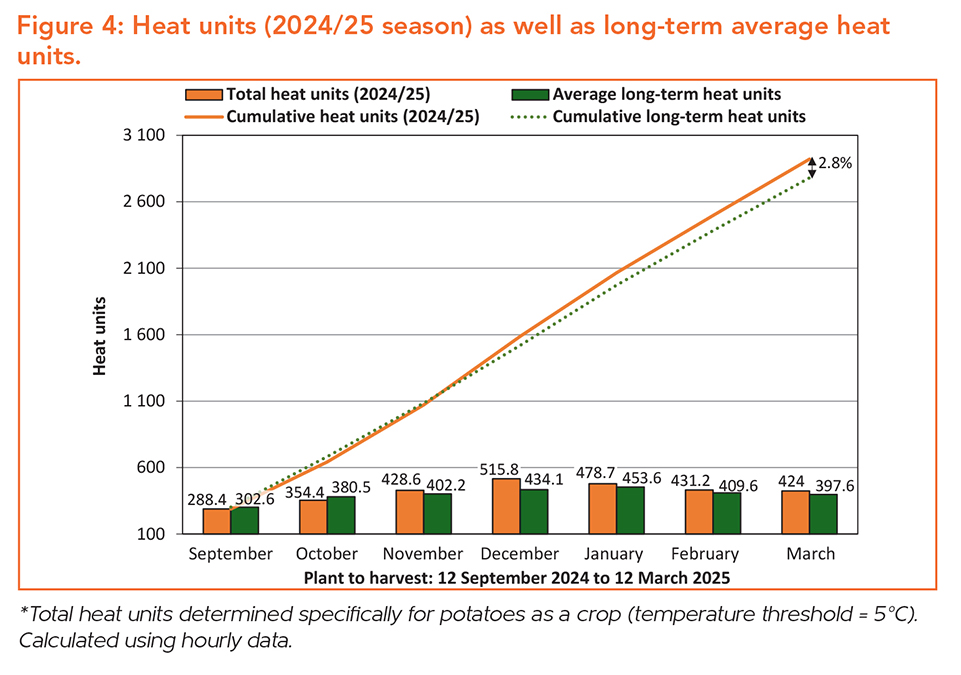 The collection of heat units during a growing period is an important factor in the development of a potato plant. The trend of heat units available for this season’s cultivar trial at Reitz appears to be close to, but slightly higher than, the long-term data trend for heat units (Figure 4).