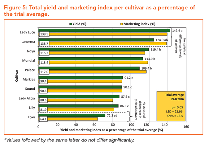 Yield data recorded during harvesting day are subjected to statistical processing using the GenStat® program. The Tukey test of least significant differences (LSD) was used to separate the mean. The cultivar effect during this trial (Figure 5) was statistically significant (p<0.05) and the coefficient of variation (CV) was low (13.5%). These factors indicate that the trial was well executed, and the results are therefore reliable.