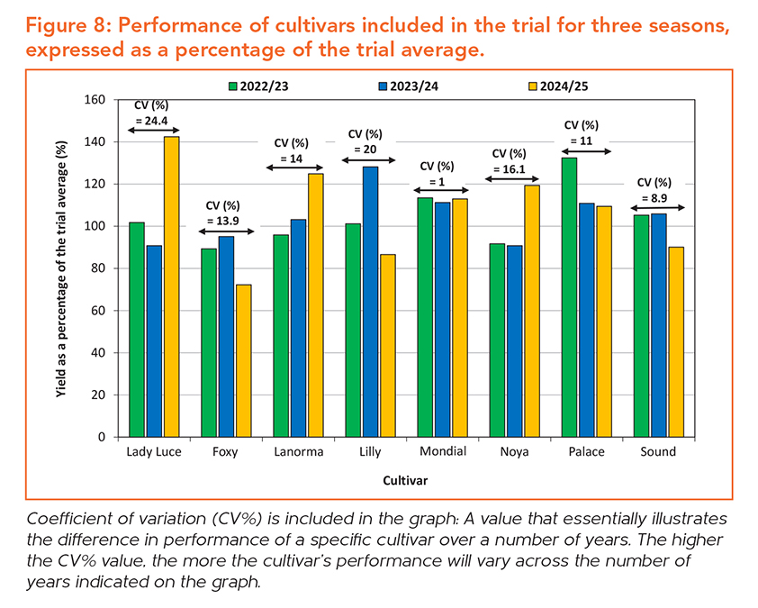 Given the nature of the seasons, the performance of cultivars will vary from one season to the next, simply because climate varies from one season to the next. Thus, it is important to consider consistent cultivar performance across various seasons. The stability of cultivars over the past three seasons is illustrated in Figure 8. Mondial and Sound showed the greatest consistency across the three seasons.