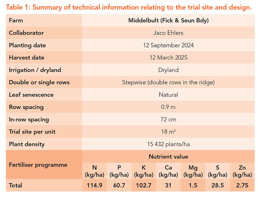 The cultivar trial at Reitz is laid out in a random block design with three replications per cultivar. Table 1 contains extra information relating to the trial.