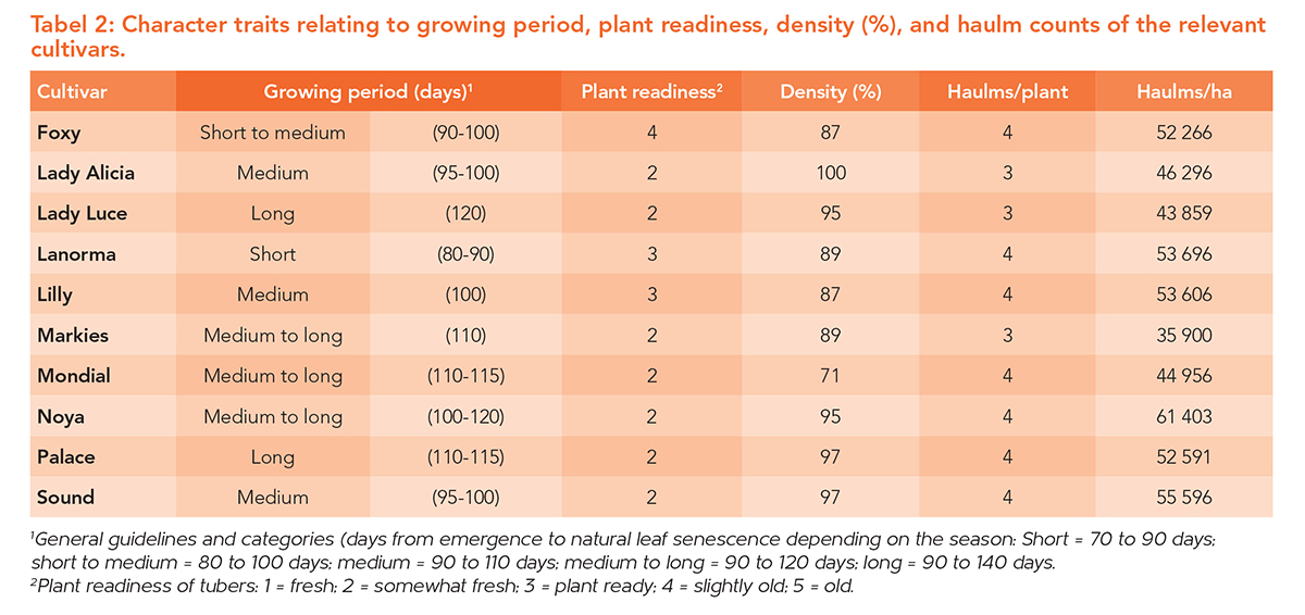 The cultivar trial includes cultivars with short and long growing periods, which can influence the final yield of certain cultivars. The length of growing periods is subject to the nature of the seasons but are generally regarded as the time that passed from emergence to natural leaf senescence. Table 2 sets out how these growing periods differ among cultivars. The plant readiness of tubers at the time of planting, as well as the haulm count observed later in the growing season, are also presented in Table 2.