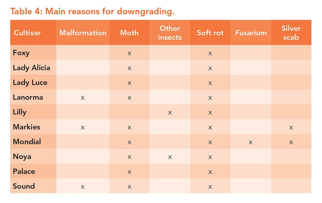 The main reasons for downgrading are indicated in Table 4. Moth and soft rot were the major reasons for the downgrading of cultivar quality in this trial. The latter can be partly attributed to the excessively wet conditions during the period before harvest.