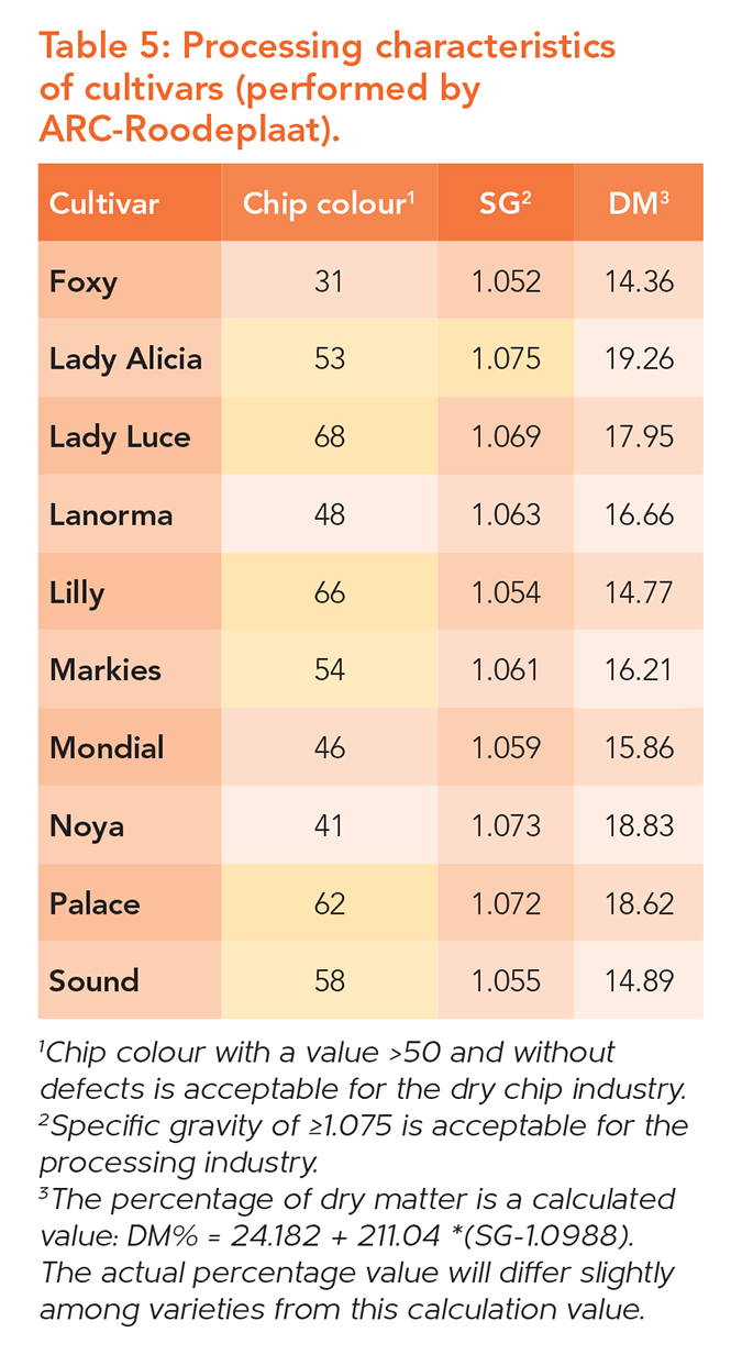 Lastly, when considering the internal quality of potatoes, processing characteristics can also be evaluated. To adhere to processing requirements, cultivars must meet a chip colour standard of >50 and a specific gravity (SG) of ≥1.075 (Table 5).