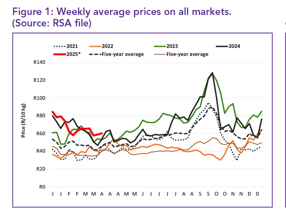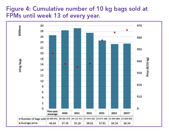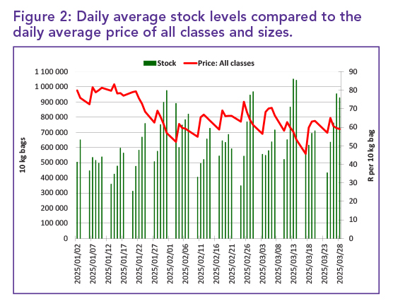 Figure 2 provides insight into the interplay between supply and demand by analysing daily average stock levels and price movements. On average, there were 646 106 10 kg bags in stock daily across South Africa’s fresh produce markets (FPMs) during the first 13 weeks of 2025.