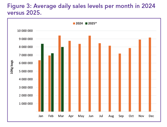 This represents a volume increase of 783 000 10 kg bags and a 10.03% year-on-year decline from March 2024, reinforcing sustained consumption trends despite price fluctuations.