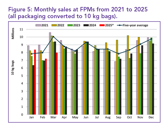 Monthly sales trends at FPMs, depicted in Figure 5, indicate a marginal month-on-month increase, with March 2025 recording 7.9 million 10 kg bags sold, compared to 7.20 million bags in February 2025.
