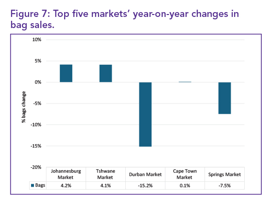 However, Figure 7 highlights a corresponding 7.5% year-on-year decline in sales volumes at this market. The volumes sold at the Johannesburg Market increased by 4.2% year-on-year.