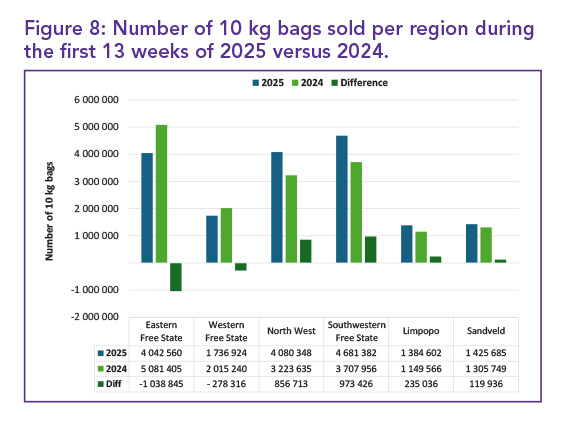 Figure 8 indicates sales performance at regional levels. The Eastern and Western Free State regions showed a decline in the first 13 weeks of the year. North West, the Southwestern Free State, Limpopo and the Sandveld regions recorded volume growth. The Eastern Free State, Southwestern Free State, Western Free State, North West, Limpopo and Sandveld collectively accounted for 74% of total national potato sales in the first 13 weeks of 2025, as summarised in Table 2.