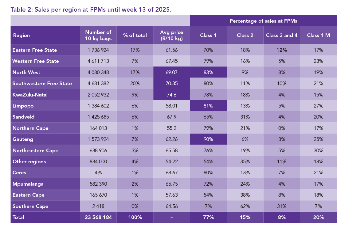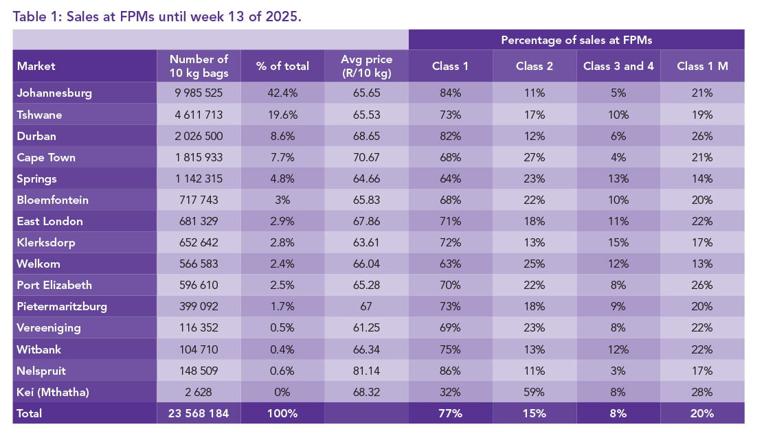 Table 1 outlines the number of bags sold at the various FPMs during the first 13 weeks of 2025. The five biggest markets during this period were collectively responsible for 83.1% of the country’s sales, showcasing their pivotal role in the potato supply chain. The average price per 10 kg bag across all classes and sizes is also reflected in Table 1.