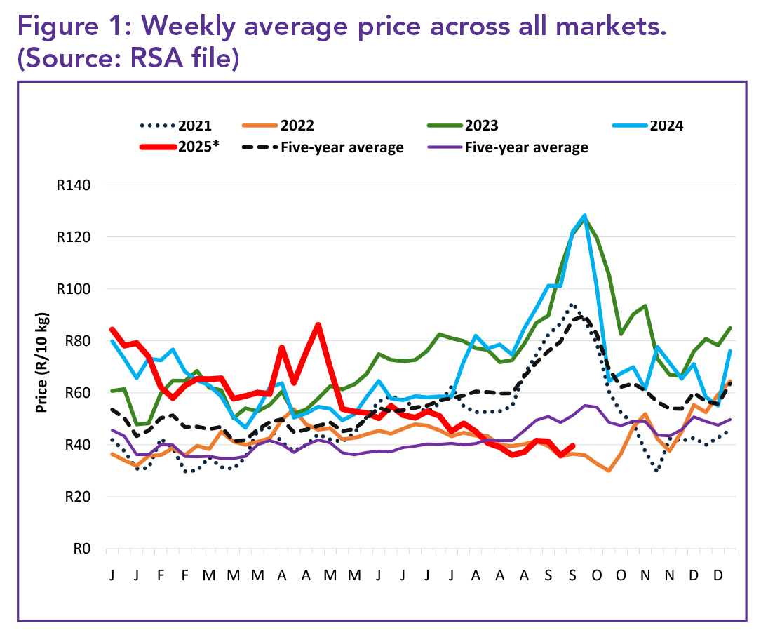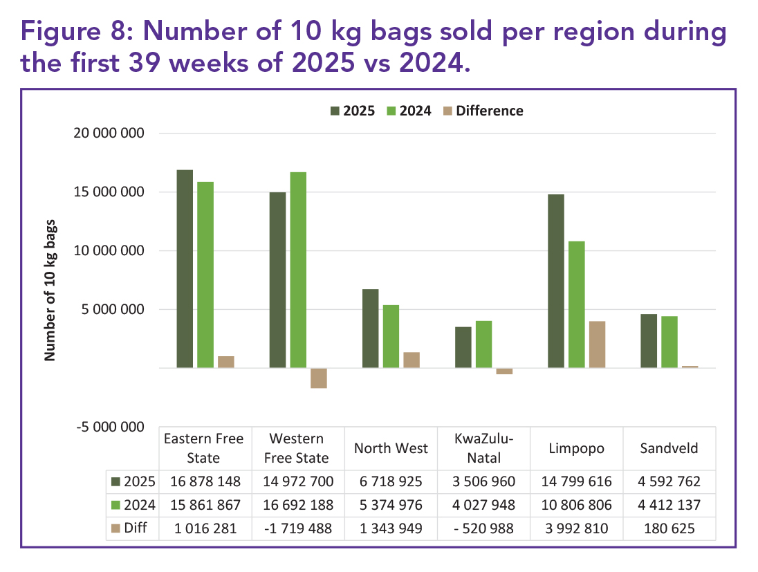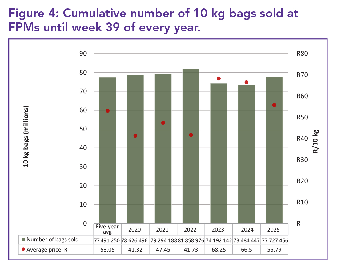 Despite this growth, cumulative sales for the first 39 weeks of 2025 totalled 77.7 million 10 kg bags, which is 236 206 bags above the five-year average for the same period, as shown in Figure 4. Notably, the average price in 2025 is R2.74 higher than the five-year average.