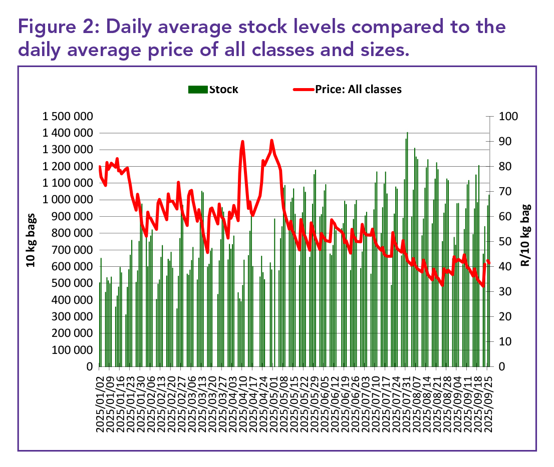 Figure 2 illustrates the relationship between supply and demand by analysing daily average stock levels alongside price trends. Elevated stock levels typically place downward pressure on prices. The average daily stock across South African FPMs was 807 596 bags (10 kg) during the first 39 weeks of 2025. In September, this figure rose to 909 842 bags – 48% higher than the September 2024 average of 614 854 bags.
