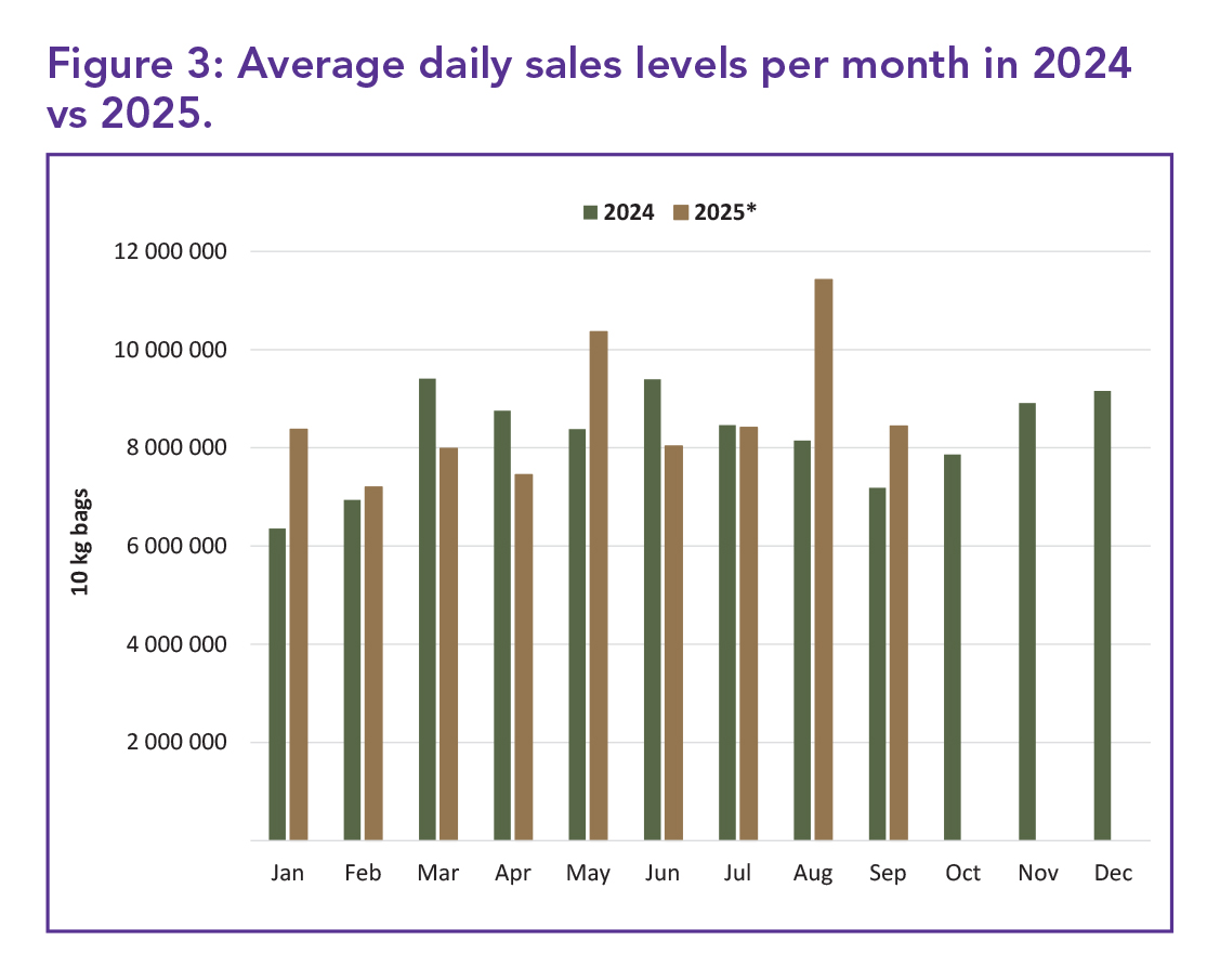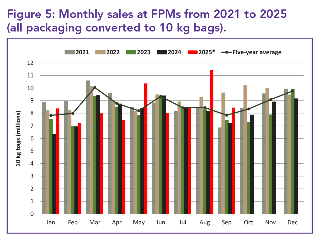 Monthly sales trends at FPMs, depicted in Figure 5, indicate a moderate month-on-month decline, with September 2025 recording 8.4 million 10 kg bags sold, compared to 11.4 million bags in August 2025. This represents a volume decline of 2 985 695 bags (10 kg).