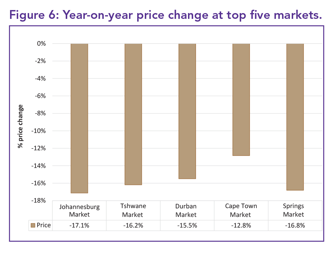 Figure 6 shows the year-on-year price change at the top five markets for the first 39 weeks of 2025, with all markets experiencing price declines. Johannesburg Market’s price showed the greatest percentage decline, decreasing by 17.1%.