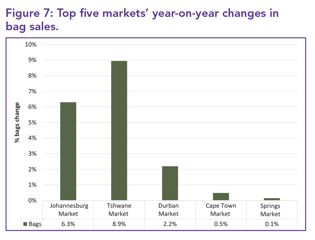 However, Figure 7 highlights a corresponding 6.3% year-on-year increase in sales volume at this market. The volumes sold at Tshwane Market increased by a notable 8.9% year-on-year.