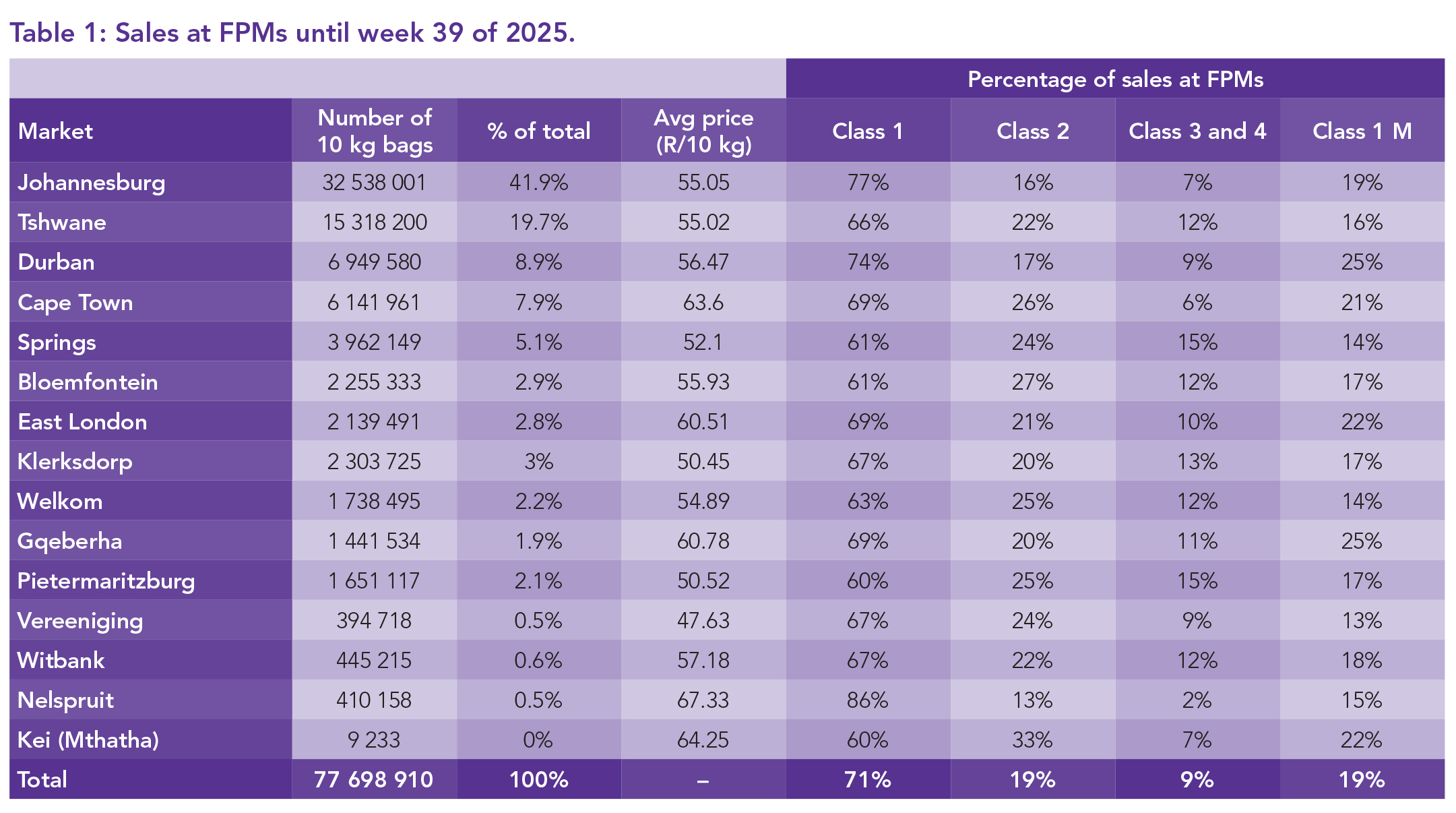 Table 1 outlines the number of bags sold at the various FPMs during the first 39 weeks of 2025. The five biggest markets during this period were collectively responsible for 83.5% of the country’s sales, showcasing their pivotal role in the potato supply chain. The average price per 10 kg bag across all classes and sizes is also reflected in Table 1.