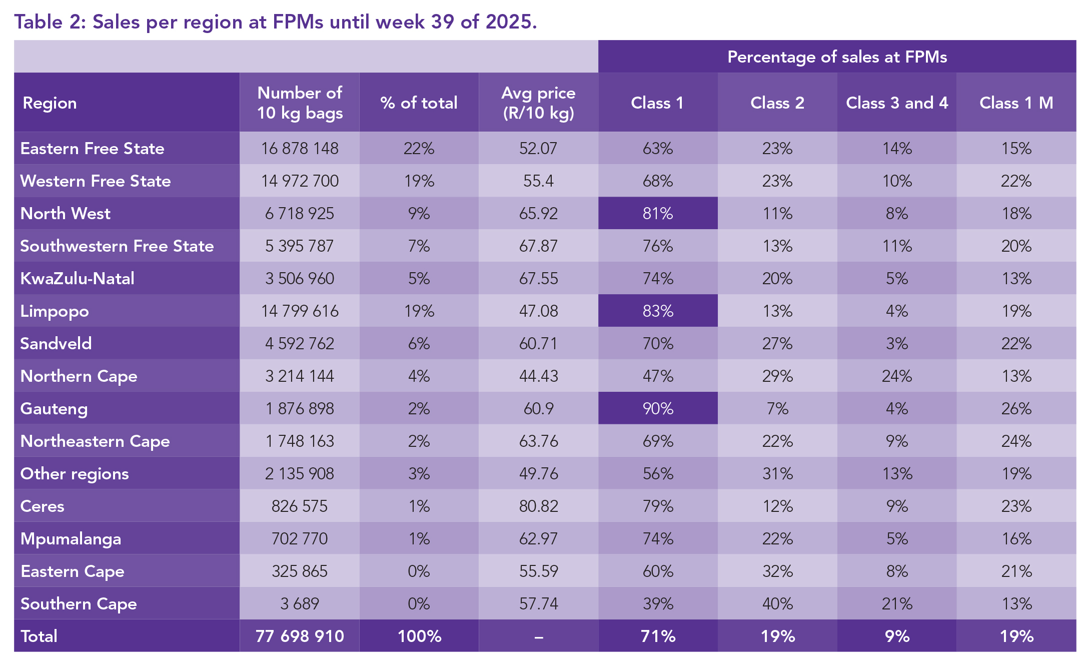 The Eastern Free State, KwaZulu-Natal, Western Free State, North West, Limpopo and the Sandveld collectively accounted for 79% of total national potato sales in the first 39 weeks of 2025, as summarised in Table 2.
