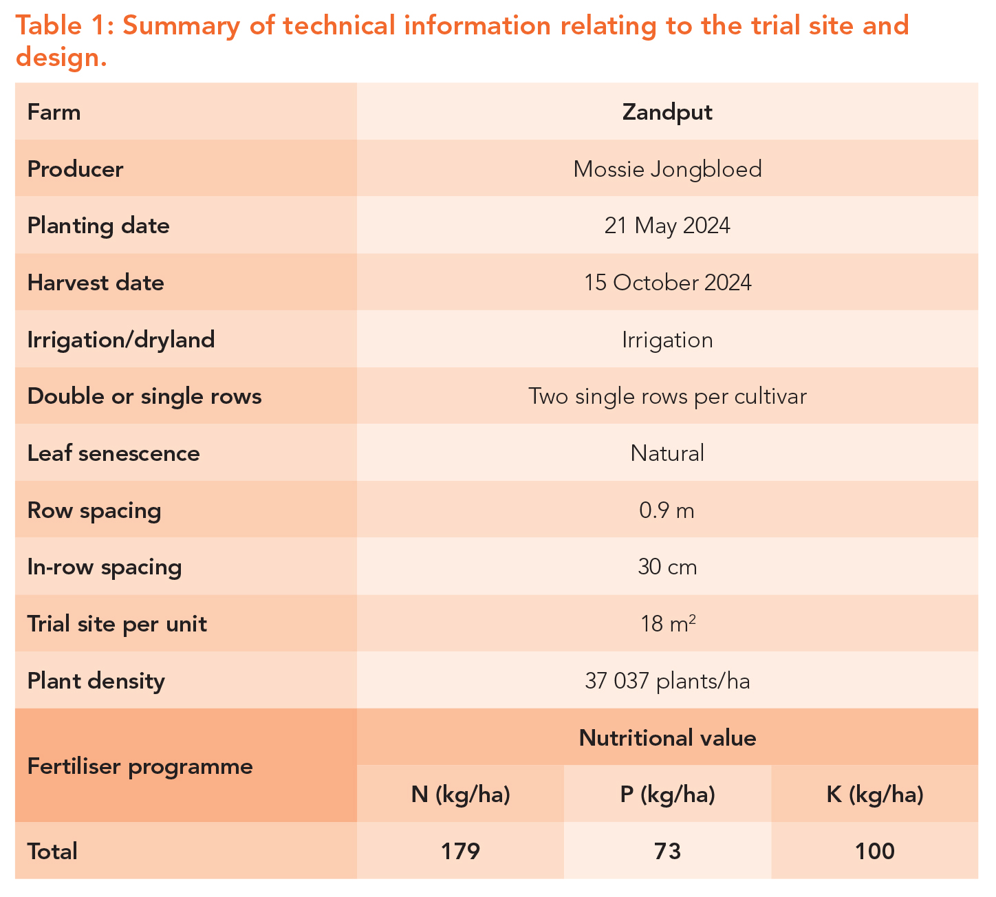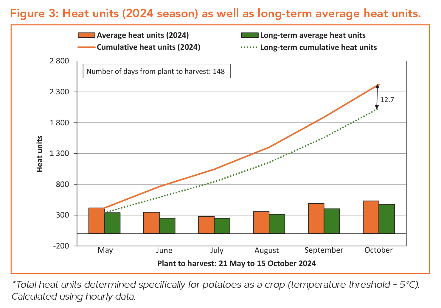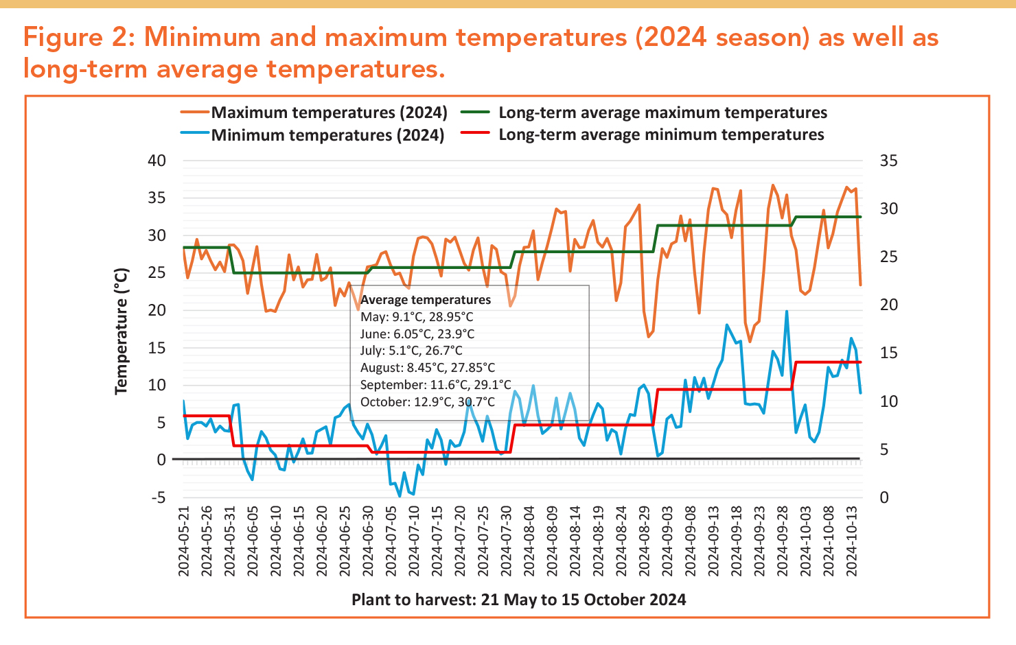 Rainfall data reflects almost no rain for the period from plant to harvest, although the long-term average rainfall for this summer rainfall area is approximately 45 mm in total for the period from May to October. Sufficient irrigation scheduling is therefore very important, especially when it is warm during important growing periods.