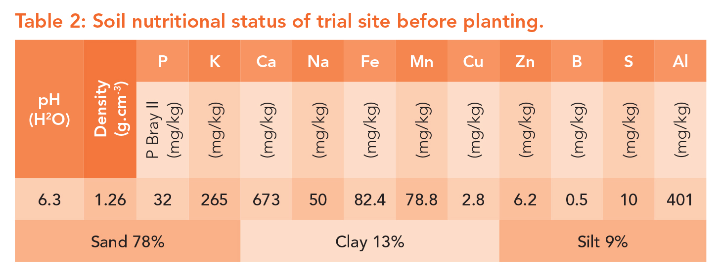 The Dendron cultivar trial is laid out in a random block design with three replications per cultivar. Table 1 contains additional information relating to the trial. Soil samples were taken prior to planting in order to determine the soil nutritional profile of the trial site (Table 2).