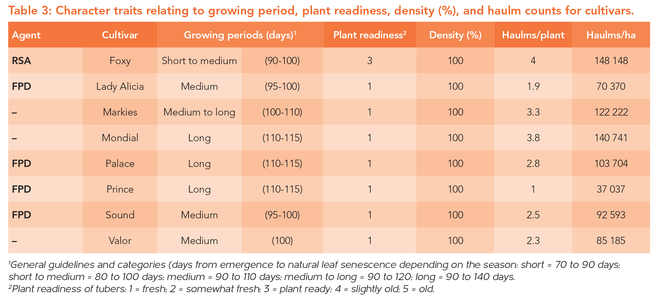 For that reason, growing periods can influence the eventual yield of certain cultivars. The length of growing periods is subject to the nature of the seasons but are generally regarded as the time that passed from emergence to natural leaf senescence. Table 3 sets out how these growing periods differ between cultivars. Table 3 also sets out the plant readiness of tubers at the time of planting, as well as the haulm count observed later in the growing season.