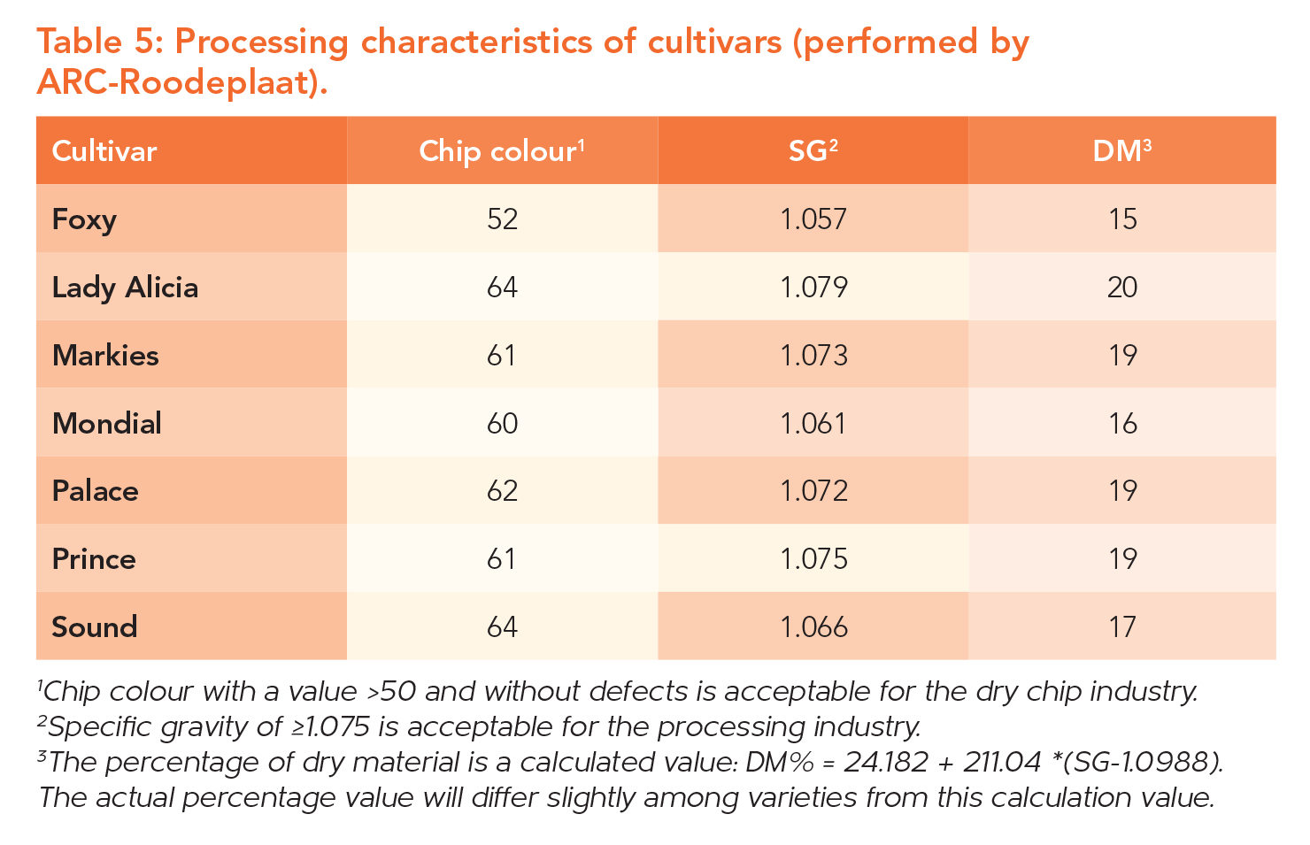 Lastly, processing characteristics can also be evaluated when looking at the internal quality of potatoes. To meet processing requirements, cultivars have to meet a chip colour norm of >50 and a specific gravity (SG) of ≥1.075 (Table 5).