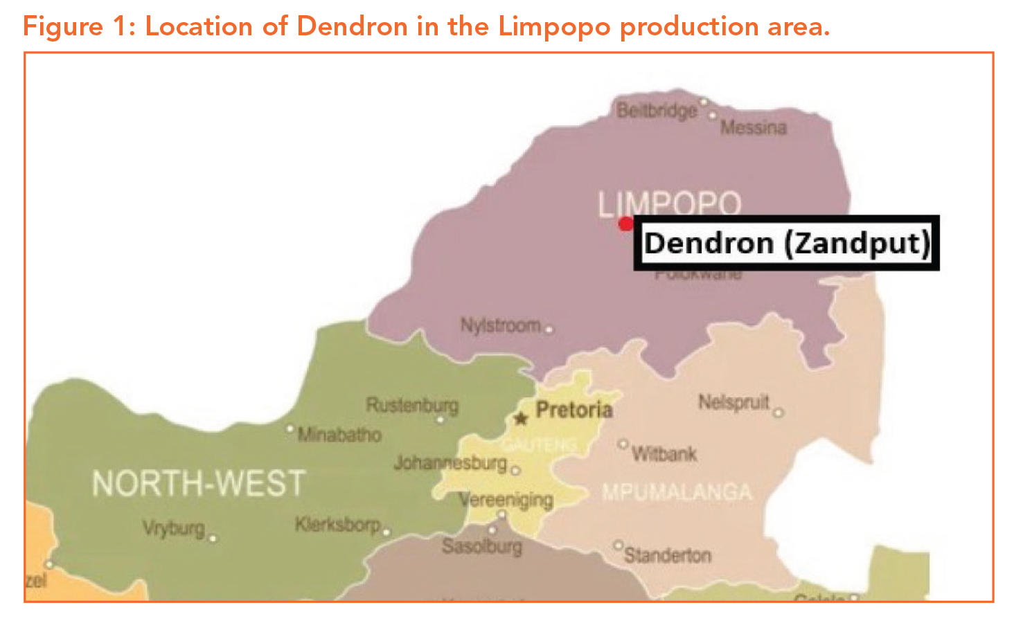 Dendron is located in South Africa’s tropical summer rainfall area (Figure 1) and has recorded an average annual rainfall of 375 mm over the past 23 years, according to data from the nearest Agricultural Research Council (ARC) weather station. The winters in this region are cool and short, whereas the summers are warm and long.