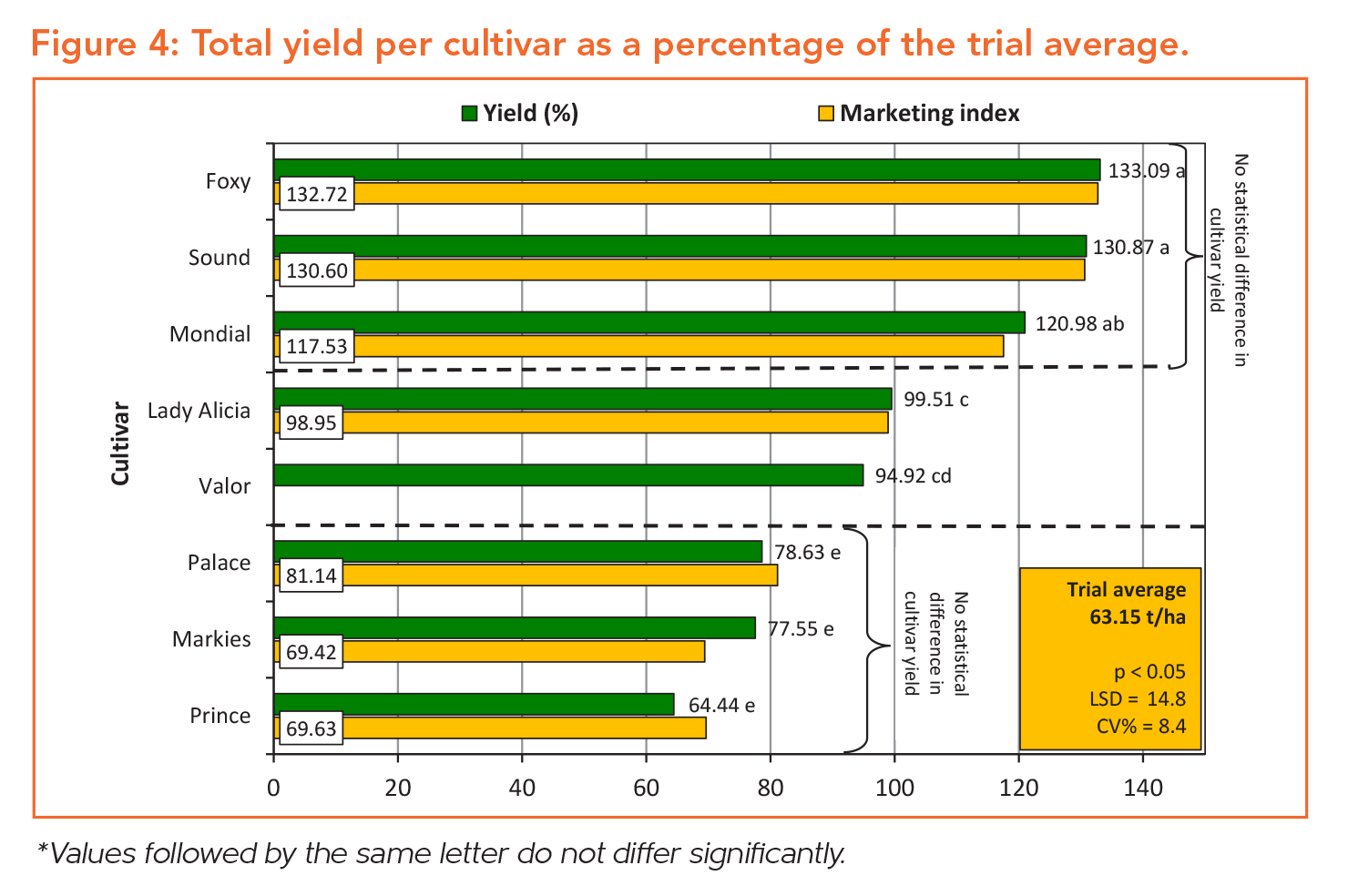 Yield data recorded during harvesting is statistically processed using the GenStat® program. The Tukey test of least significant differences (LSD) was used to separate the average. The cultivar effect during this trial (Figure 4) was statistically significant (p<0.05) and the coefficient of variation (CV) was good (8.4%). These factors indicate that the trial was well executed, and that the results are therefore reliable.