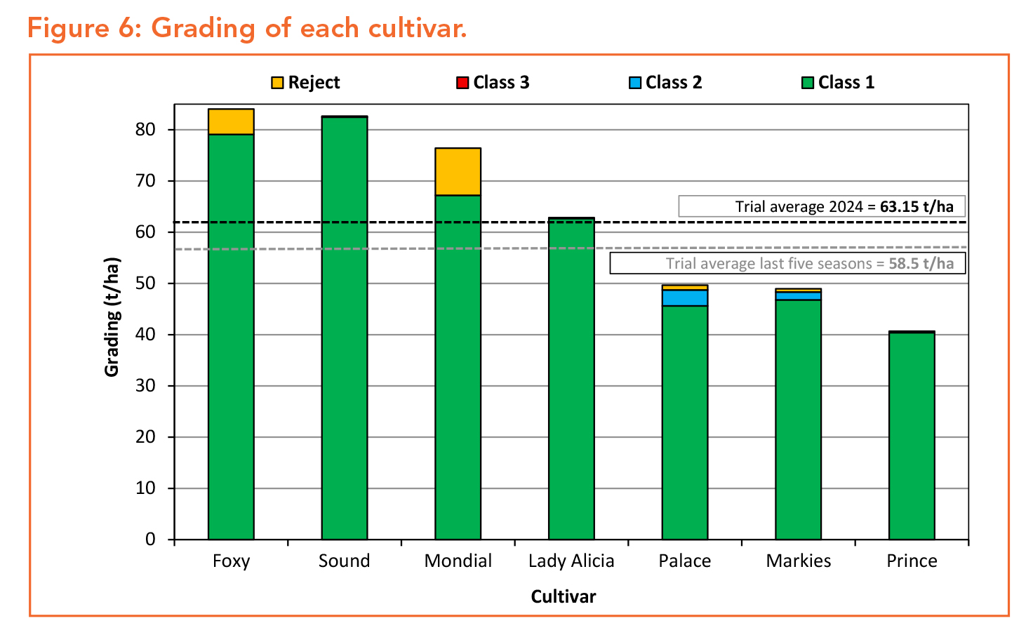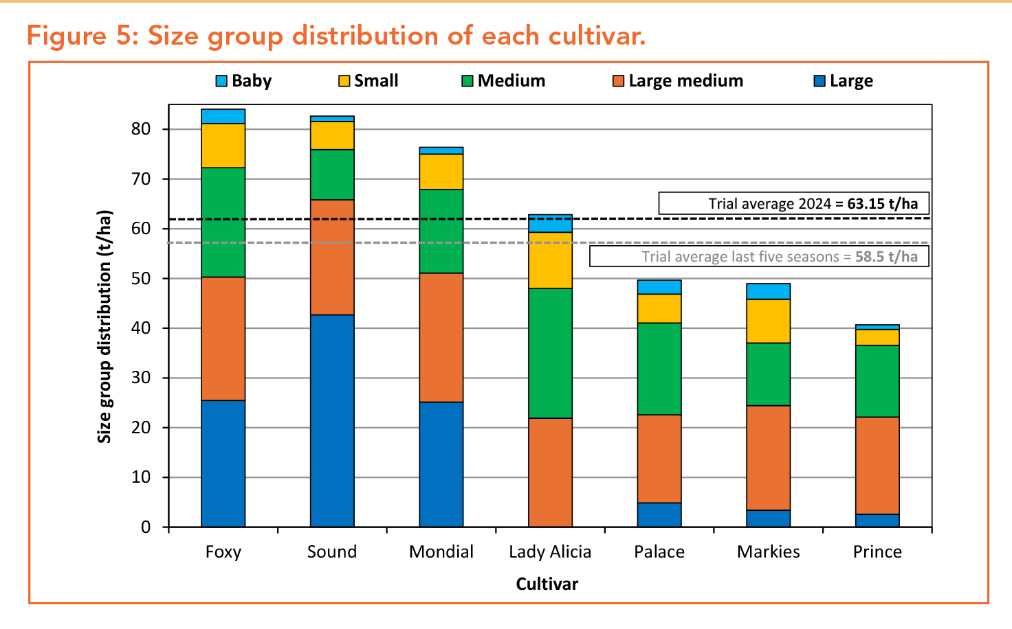 The average yield of the trial for the 2024 season was 63.15 t/ha. This was higher than the previous four seasons’ average of 57.38 t/ha. Foxy, Sound, and Mondial delivered the best yield with no statistical difference in yield.