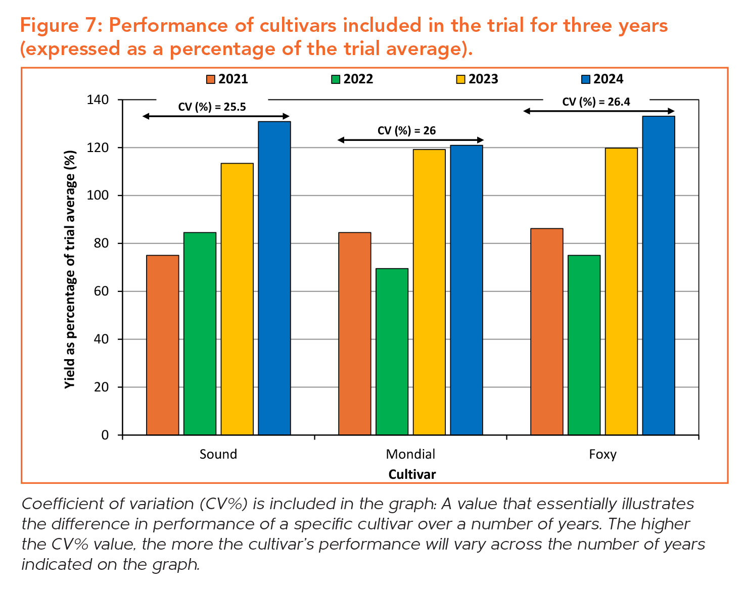 Due to the nature of the seasons, cultivar performance will vary from one season to the next, simply because climate varies from one season to the next. Thus, it is important to consider consistent cultivar performance across a number of seasons. Figure 7 illustrates the last three seasons’ variations in cultivar performance.