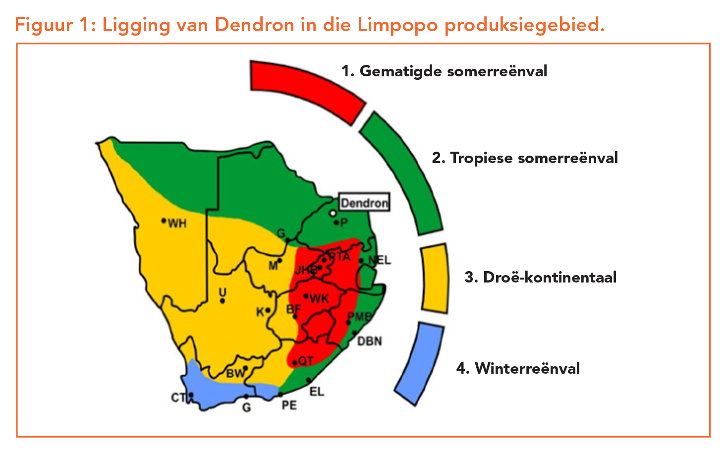 Limpopo is ’n groot aartappelproduksiestreek waar ongeveer 25% van die land se totale kommersiële aartappels deur 103 produsente geproduseer word. Die mees prominente kultivars wat in die streek geproduseer word vir tafelverbruik en verwerking, is Mondial, Valor en Sifra. Dendron val in Suid-Afrika se tropiese somerreënvalgebied (Figuur 1) en ervaar die afgelope 21 jaar ’n gemiddelde jaarlikse reënval van 362 mm volgens inligting verkry vanaf die nabygeleë Landbounavorsingsraad (LNR)-weerstasie. Winters in hierdie streek is koel en kort, terwyl somers baie warm en lank is. Gedurende die wintermaande, van Mei tot Julie, ervaar die streek langtermyntemperature van gemiddeld 6°C minimum en 24°C maksimum, met baie min dae waartydens die kwik onder 0°C daal. Derhalwe is twee produksieseisoene hier moontlik: ’n Vroeë aanplanting gedurende Januarie tot Maart, met die hoofaanplanting vanaf April tot Julie.