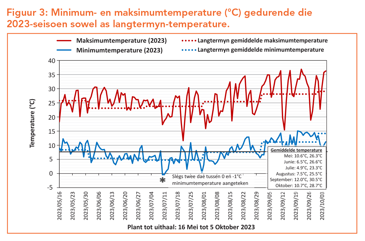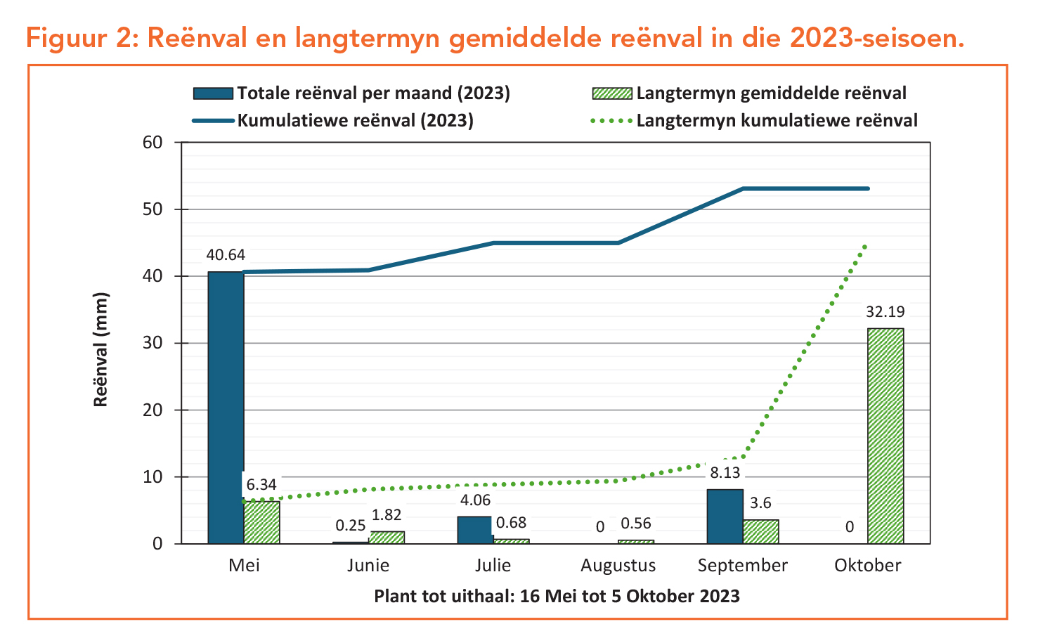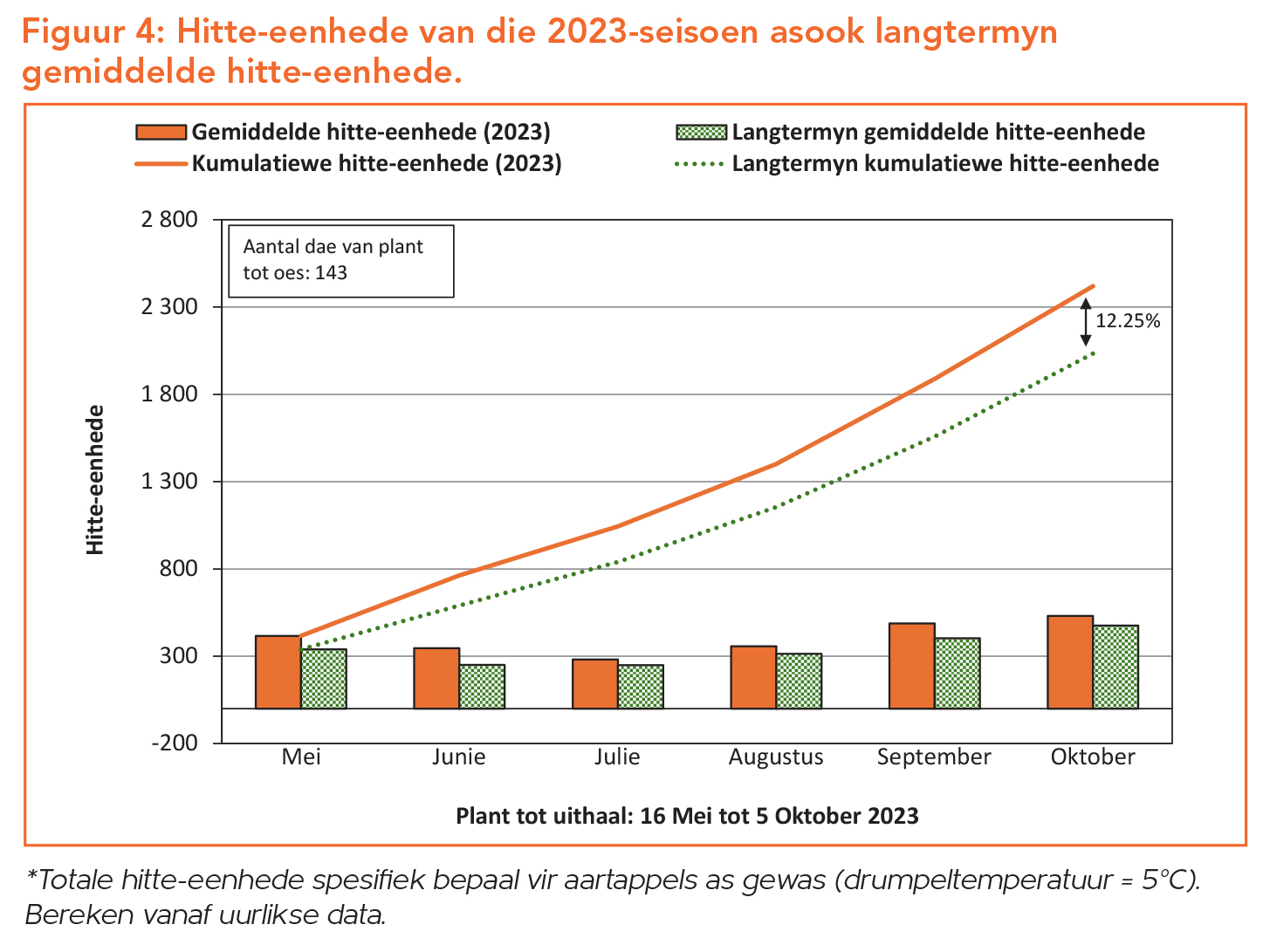 Toepaslike daaglikse weerdata vir die betrokke seisoen word verkry vanaf ’n weerstasie wat naby aan die proef geleë is, terwyl langtermyn data vanaf die naaste LNR-weerstasie verkry word. Reënvaldata is in Figuur 2 aangeteken. Oktobermaand kry tradisioneel meer reënval as wat vir hierdie seisoen aangeteken is. Omdat Dendron somerreënval kry, is voldoende besproeiingskedulering baie belangrik, veral gedurende kritieke groeitye wanneer dit warm is. Minimum- en maksimumtemperature word in Figuur 3 uiteengesit. Groot fluktuasies in maksimumtemperature gedurende die laaste drie maande van die seisoen is sigbaar. Geen noemenswaardige ryp is aangeteken nie, met slegs twee dae gedurende die hele seisoen waartydens die kwik effens onder vriespunt gedaal het. Die versameling van hitte-eenhede gedurende ’n groeitydperk is ’n belangrike faktor in die ontwikkeling van ’n aartappelplant. Die tendens van hitte-eenhede beskikbaar vir die kultivarproef van hierdie seisoen by Dendron, blyk hoër as die langtermyndatatendens van hitte-eenhede te wees, danksy ‘n ietwat warmer as langtermyngemiddelde winter (Figuur 4).