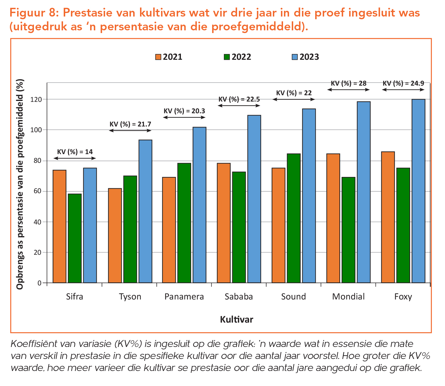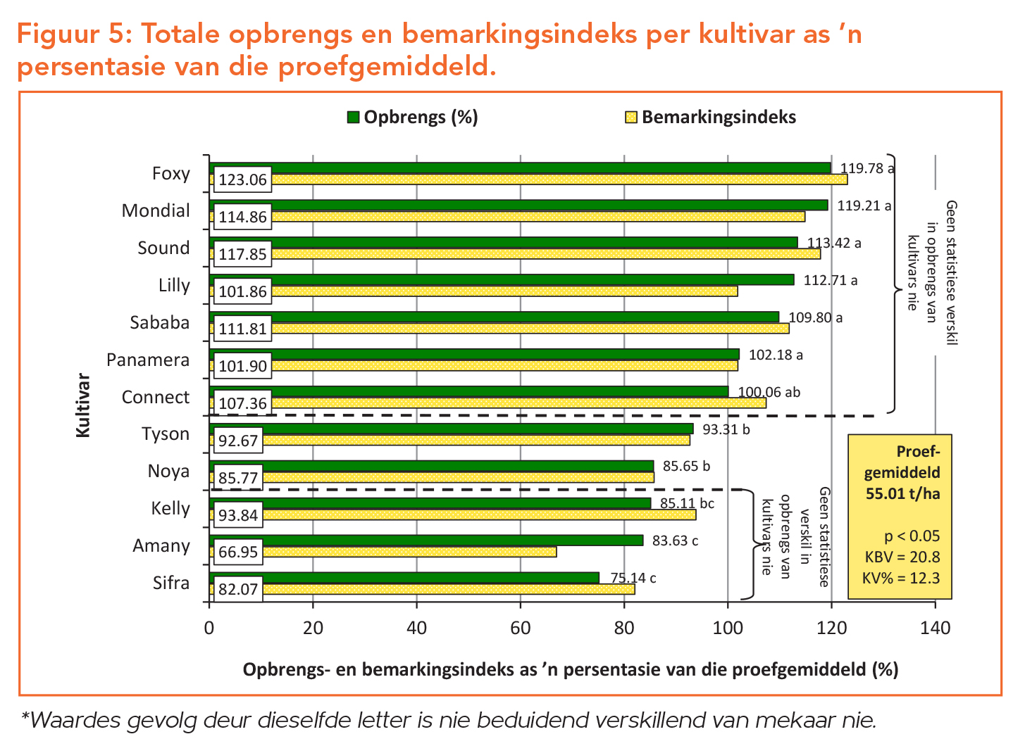 Opbrengsdata versamel tydens oesdag word onderwerp aan statistiese verwerking met behulp van die GenStat®-program. Die Tukey-toets van kleinste betekenisvolle verskille (KBV) is gebruik om die gemiddelde te skei. Die kultivareffek gedurende hierdie betrokke proef (Figuur 5) was statisties beduidend (p<0.05) en die koëffisiënt van variasie was goed (12.3%). Hierdie faktore dui daarop dat die proef so goed as moontlik uitgevoer is en die resultate derhalwe betroubaar is. Die opbrengs van elk van die kultivars word deur die proefgemiddeld gedeel – die proefgemiddeld van al die kultivars word as 100% geneem. Hierdeur word ’n opbrengsindeks bepaal en word elke kultivar se prestasie in terme van opbrengs as ’n persentasie van die proefgemiddeld gelees.