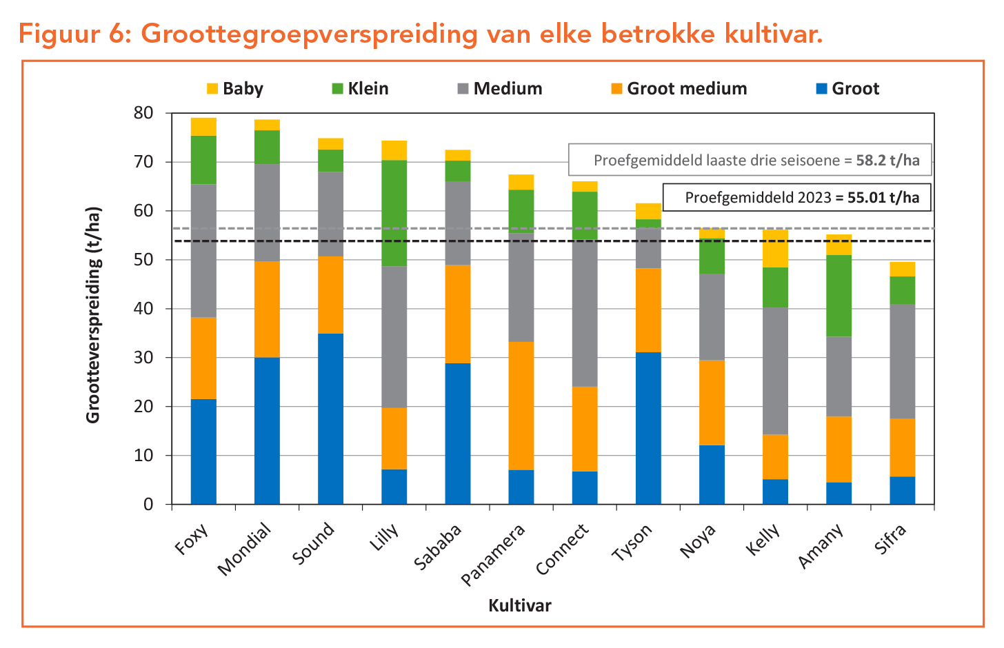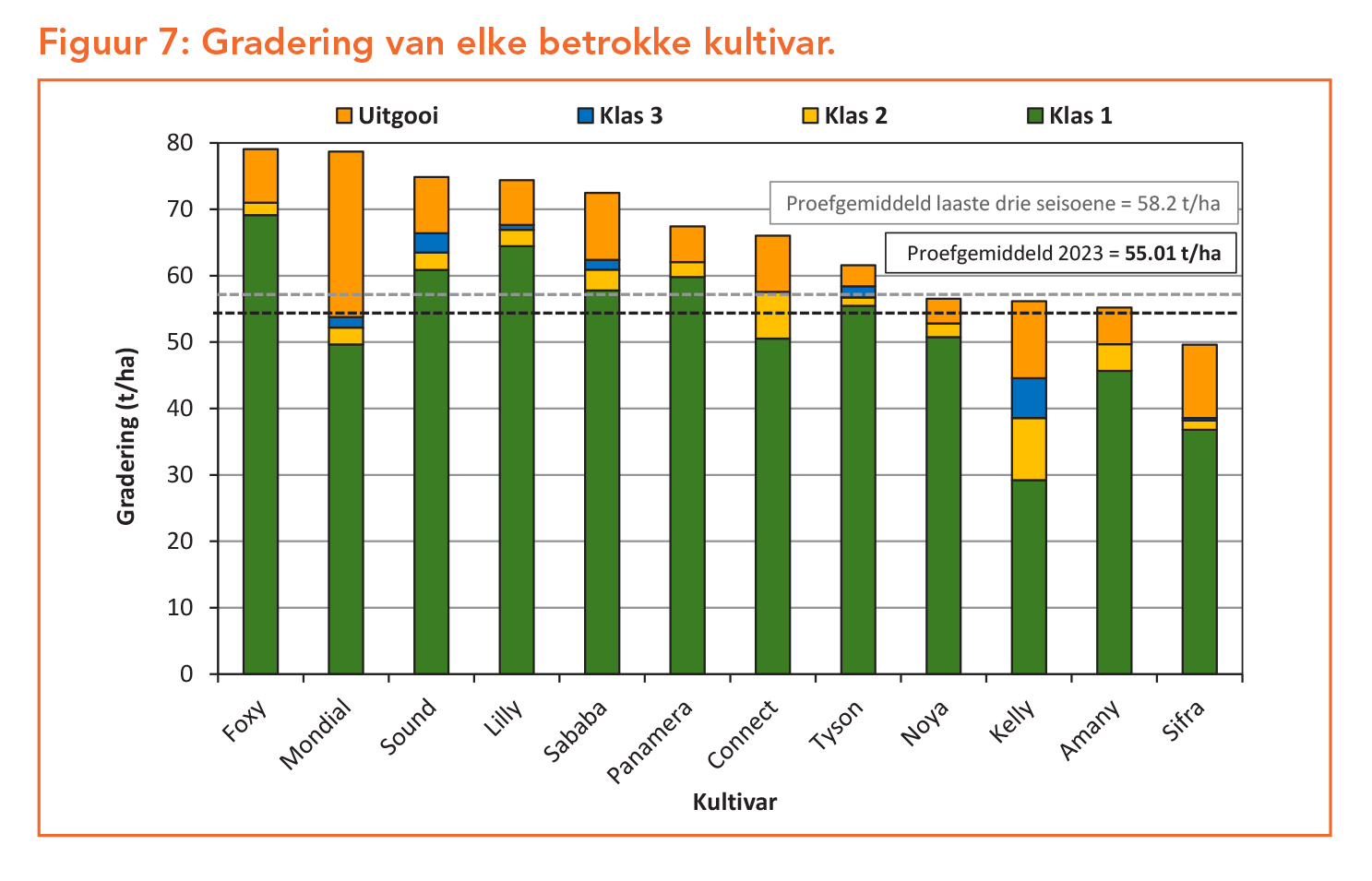 Die gemiddelde opbrengs van die proef vir die 2023-seisoen is 55.01 t/ha. Dit is effens laer as die vorige drie seisoene se gemiddeld van 58.17 t/ha. Foxy, Mondial, Sound, Lilly, Sababa, Panamera en Connect het almal die beste opbrengs gelewer, met geen statistiese verskil in opbrengs nie. Foxy, Sound en Mondial het ook die beste bemarkingsindekse behaal. ’n Goeie bemarkingsindeks word toegeskryf aan ’n hoër opbrengs van Groot aartappels en/of ‘n goeie persentasie wat van goeie gehalte is.