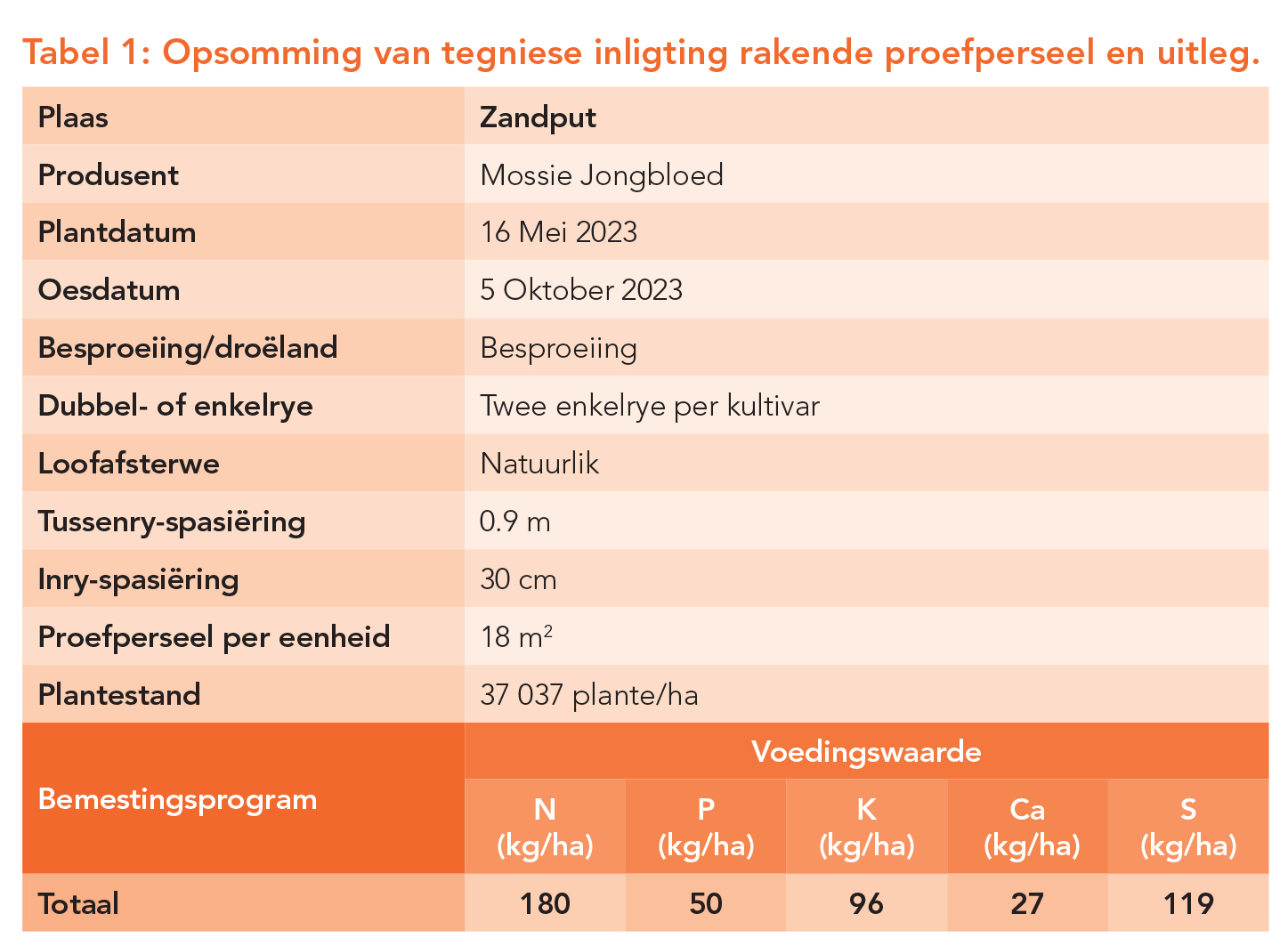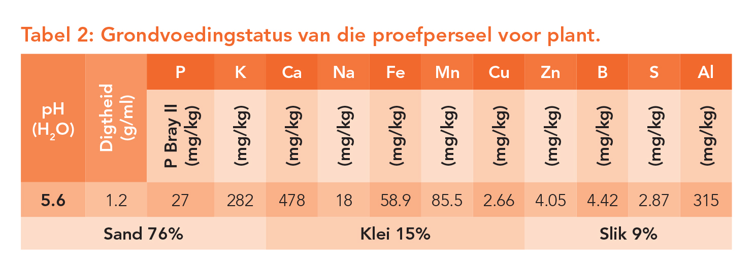 Danksy hierdie twee aanplantings is die streek se bydrae tot die bedryf in Suid-Afrika een van die grootstes. Die kultivarproef by Dendron is in ’n ewekansige blokontwerp met drie herhalings per kultivar uitgelê. Tabel 1 bevat bykomende tegniese inligting rakende die proef. Grondmonsters is voor plant geneem om die grondvoedingstatus van die proefperseel te bepaal (Tabel 2).