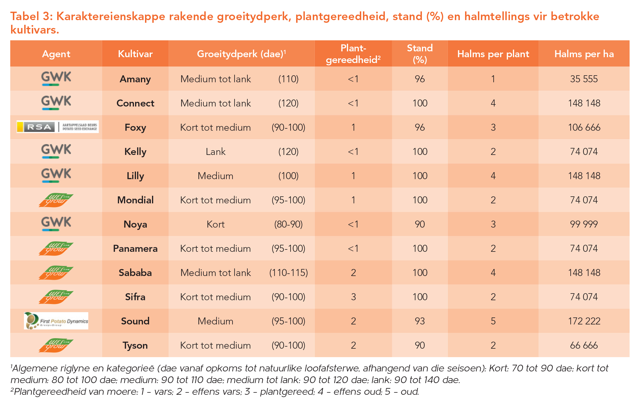 Ingesluit in die kultivarproef is kultivars met kort en lang groeitydperke; derhalwe kan groeitydperke die uiteindelike opbrengs van sekere kultivars beïnvloed. Die lengte van groeitydperke is onderhewig aan die aard van die seisoen, maar word gesien as die hoeveelheid tyd wat verloop vanaf opkoms tot natuurlike loofafsterwe. Tabel 3 sit uiteen hoe hierdie groeitydperke van kultivar tot kultivar verskil. Plantgereedheid van moere ten tye van die plant van die proef, sowel as standpersentasie en halmtelling wat later in die groeitydperk waargeneem is, word aangedui in Tabel 3.