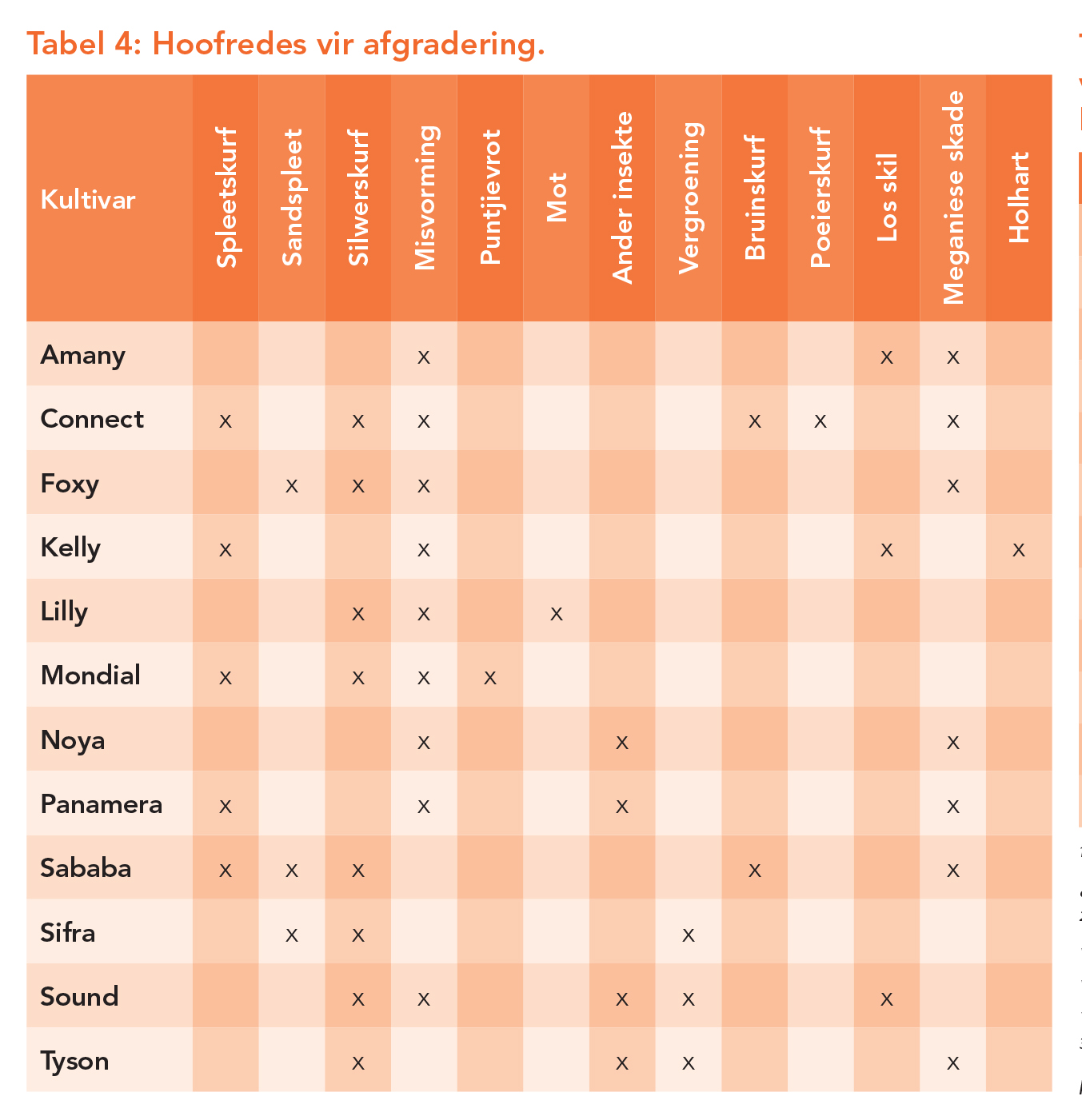 Groottegroepverspreiding en gradering is onontbeerlike evaluasies wanneer gekyk word na ’n aartappelkultivar se bemarkbaarheid (Figure 6 en 7). Die hoofredes vir afgradering word aangedui in Tabel 4. Misvorming en silwerskurf het die grootste invloed op die gehalte van aartappels in hierdie proef gehad. Soos die aard van seisoene is, fluktueer die prestasie van kultivars van seisoen tot seisoen. Dit is bloot omdat klimaat van een seisoen na ’n volgende nooit eenders is nie. Derhalwe is dit belangrik om konsekwente prestasie van kultivars oor ’n aantal seisoene in ag te neem. Die afgelope drie seisoene se variasie onder deelnemende kultivars word in Figuur 8 aangedui.
