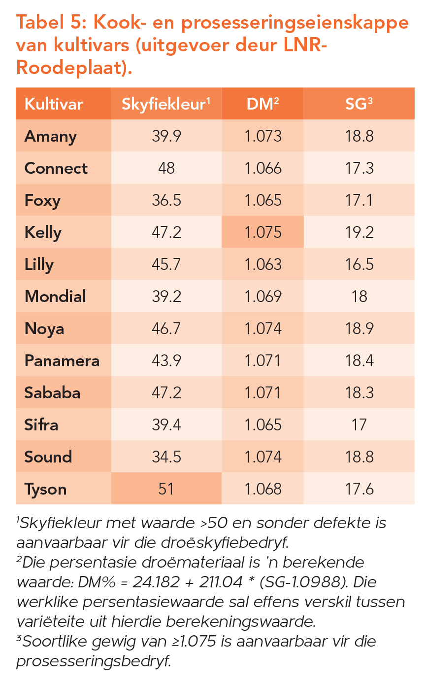 Laastens, wanneer daar gekyk word na interne kwaliteit van aartappels, kan prosesseringseienskappe ook geëvalueer word. Om te voldoen aan prosesseringsvereistes, moet kultivars aan ’n skyfiekleurnorm van >50 en ’n soortlike gewig (SG) van ≥1.075 voldoen (Tabel 5). Tyson het aan die vereiste skyfiekleur voldoen terwyl Kelly aan die SG-vereiste voldoen het. – Enrike Verster, Aartappels SA
