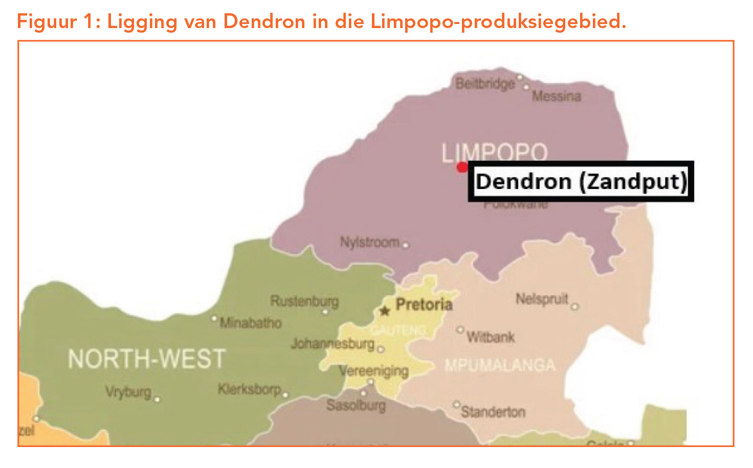 Dendron val in Suid-Afrika se tropiese somerreënvalgebied (Figuur 1) en ontvang die afgelope 23 jaar ’n gemiddelde jaarlikse reënval van 375 mm, volgens die nabygeleë Landbounavorsings- of LNR-weerstasie. Winters in hierdie streek is koel en kort, terwyl somers baie warm en lank is.